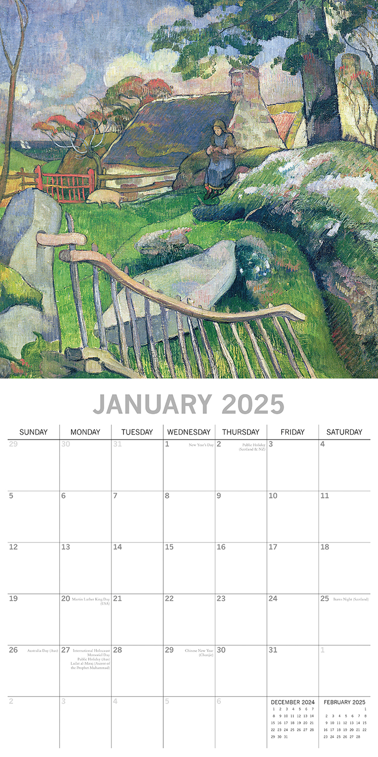 Embark on a journey to the tropics with Paul Gauguin’s 2025 calendar. Revel in his bold use of color and exotic scenes that echo his love for Tahitian landscapes.This beautifully designed, brand-new calendar is both 100% plastic-free and fully recyclable. It comes shrink-wrapped in its original packaging and features: