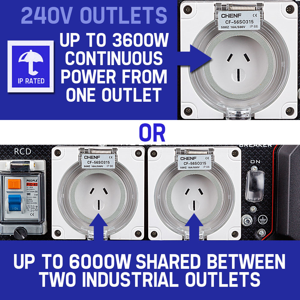 The GX12025i features Throttle and Digital Voltage Control employing GenPower’s Patented AVR (Auto Voltage Regulator) ensuring stable voltage supply via two commercial-grade 240V IP rated protected outlets.