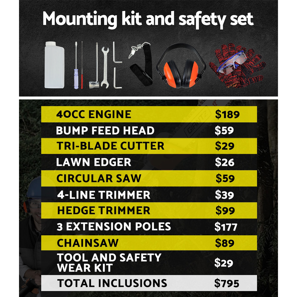 The GIANTZ Pro-series Chainsaw is the answer for people who are looking for doing serious cutting and bring it to the next level. Featuring a powerful 40cc, 4-stroke full crank engine for smoother starting and running, the chainsaw trims and cuts every gardening challenge in its path with minimum hassle. Efficient and lightweight in design and equipped with a comfortable D-handle, the chainsaw allows quick-connect coupling for easy change of attachments. In fact, up to nine attachments for every conceivable cutting job. Better still, the chainsaw also comes with three extra thick alloy extension poles which allows you to reach for those hard-to-get branches. Not least, the cutting equipment also features fine quality construction and cutting-edge technology to ensure the chainsaw remains reliable, durable and sharp consistently.