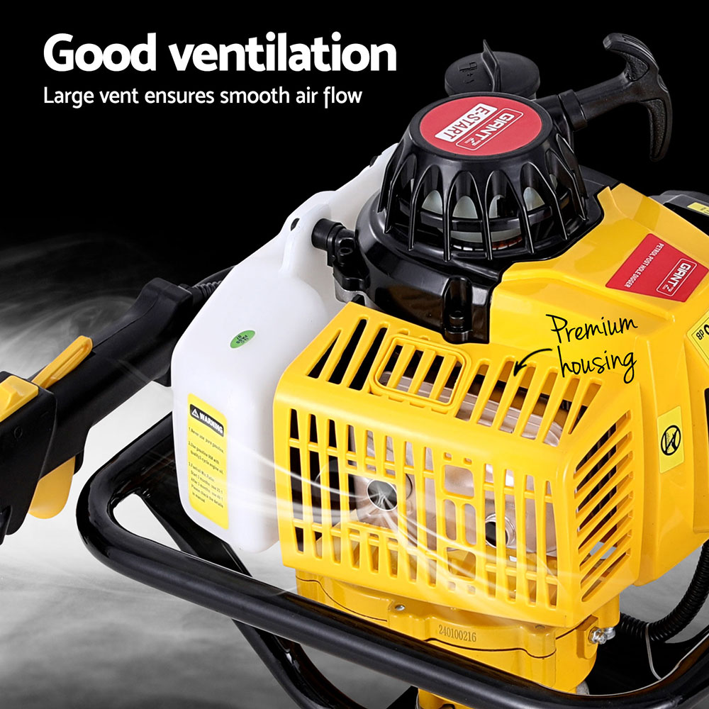 Introducing our robust Giantz Post Hole Digger, crafted from heavy-duty steel for durability, featuring a simple recoil start, vertical gearbox for enhanced performance, anti-vibration handle for comfort, easy-to-fill fuel tank, high torque output, and reliable efficiency.