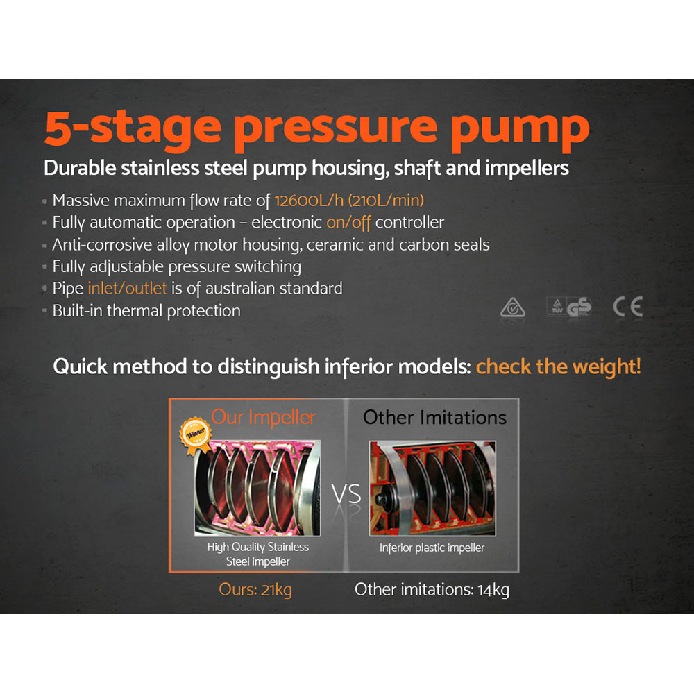 Our weight matches quality compared to others offering similar products but are lighter in weight and are made of plastic impellers which are fragile. So don't be fooled by the cheap models with easy broken plastic impellers on the market, ensure to confirm before you buy! Our pump has Professional Grade Stainless Steel on the Body, Motor Housing, Shaft and Impellers. Our Multi-stage pump surpasses all the cheap models on the market in terms of Performance and Durability!