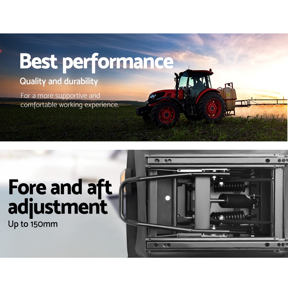 Our Tractor Seat comes with all the necessary features that make it a better working experience for you: adjustable weight suspension to accommodate weights between 50 and 130kg, adjustable headrest and backrest, foldable armrest, fore and aft sliding track adjustment of up to 150mm, and thick padded seat upholstered in high quality black PU leather for extra durability and weatherproofing. Everything is designed to take into account your requirements for a seat that matches your work environment perfectly and totally.
