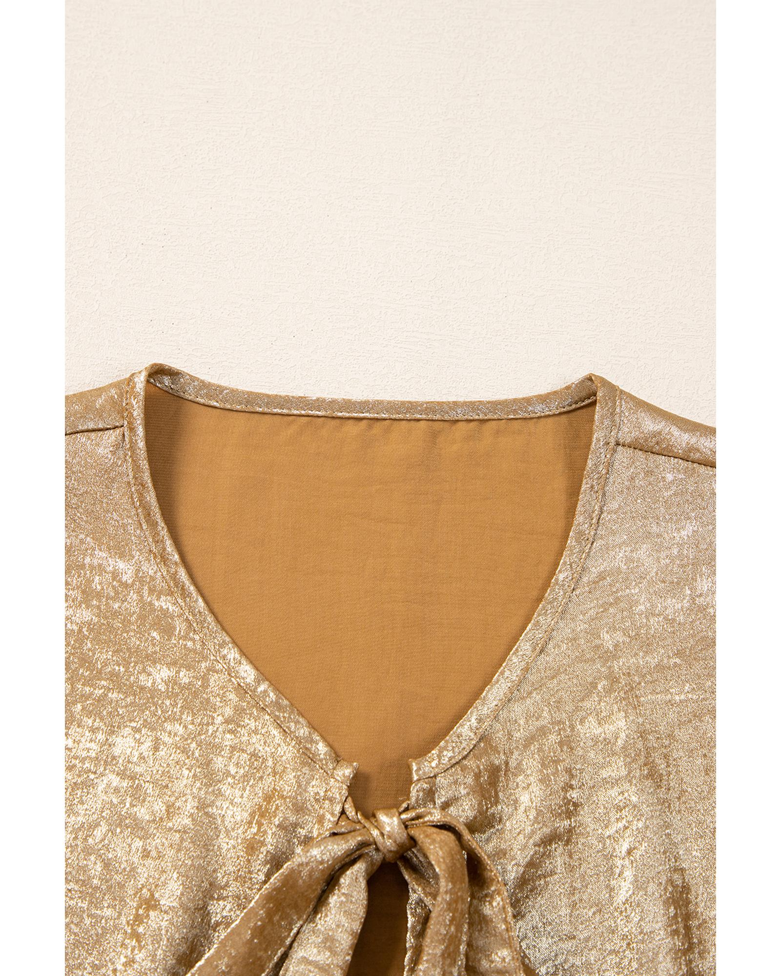 • Gold Bow Tie Front Puff 3/4 Sleeve Ruffle Hem Blouse