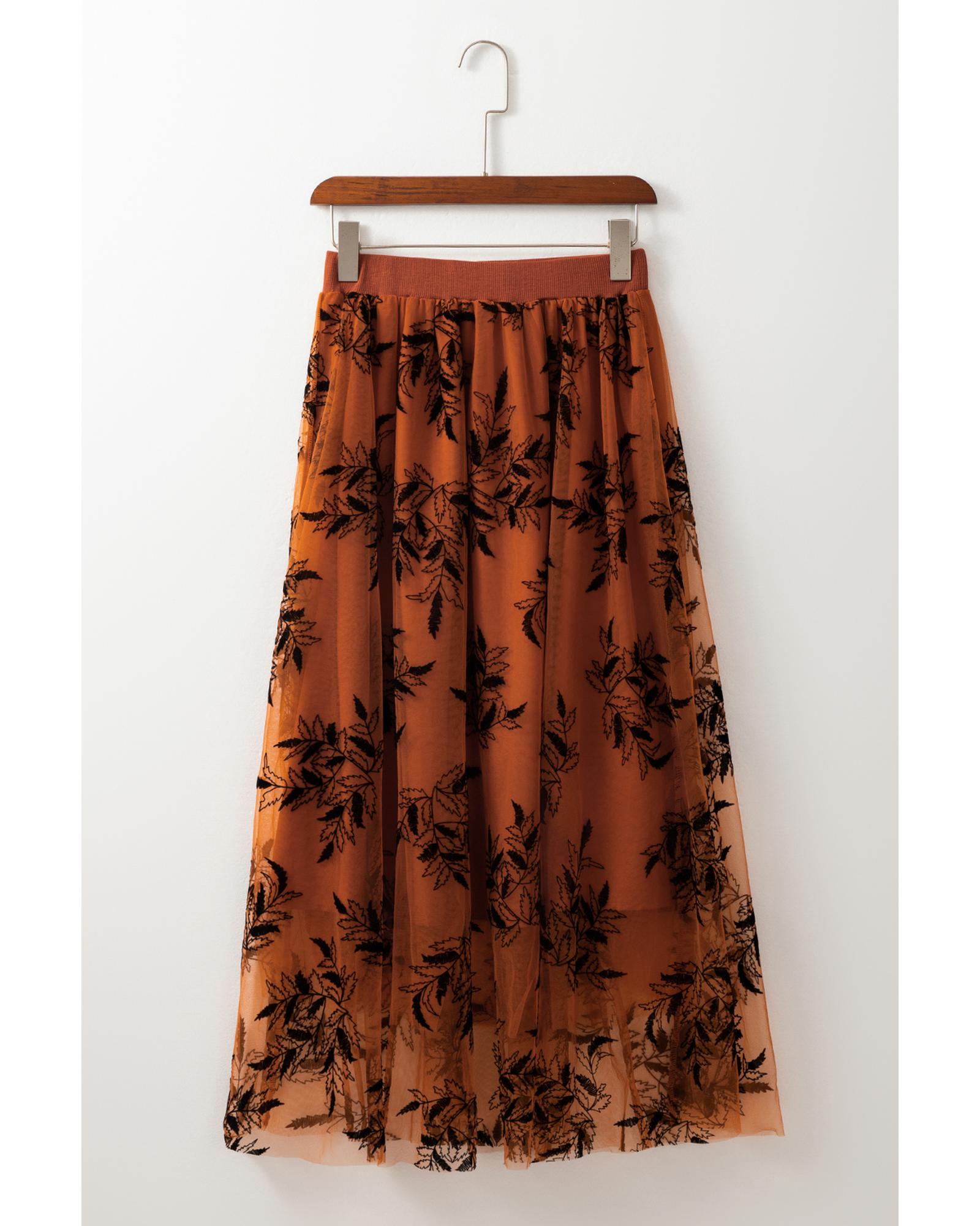Gold Flame Floral Leaves Embroidered High Waist Maxi Skirt – M