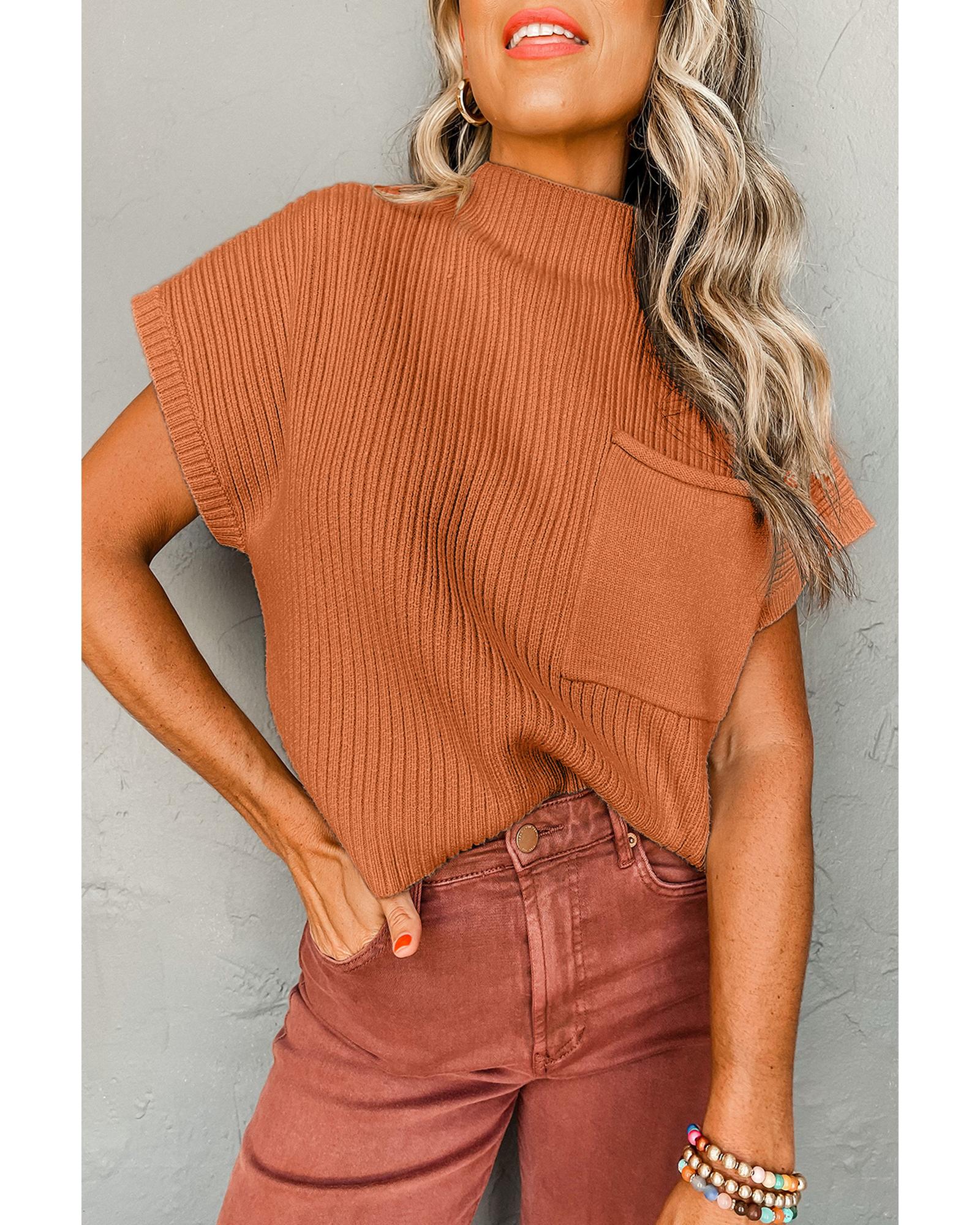 - Gold Flame Patch Pocket Ribbed Knit Short Sleeve Sweater