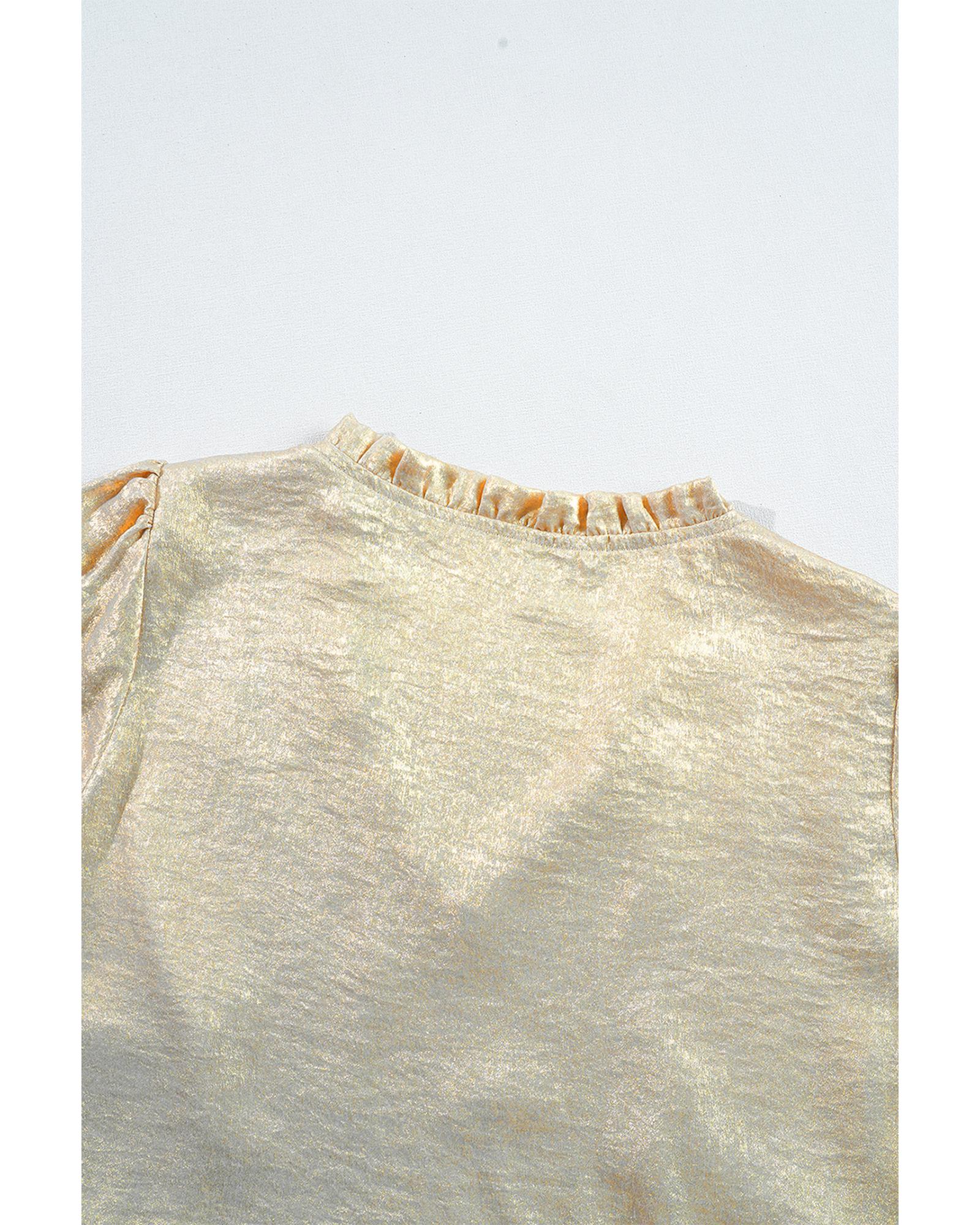 Gold Metallic Frilled V Neck Puff Sleeve Babydoll Blouse – M