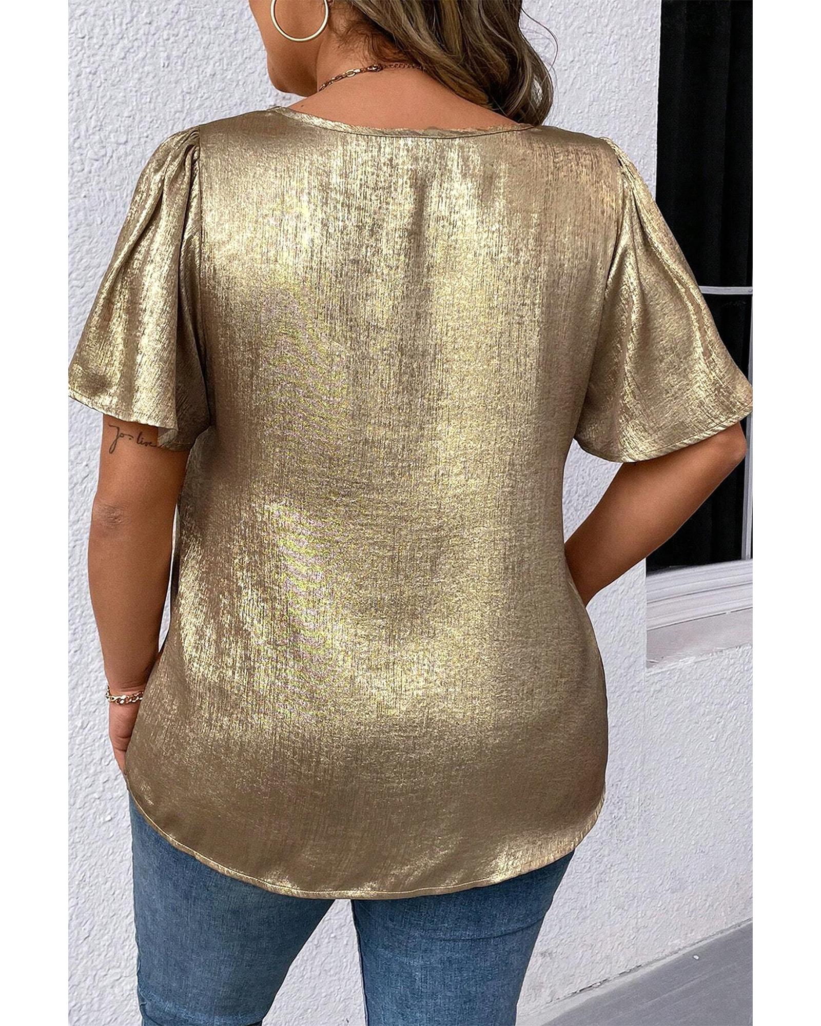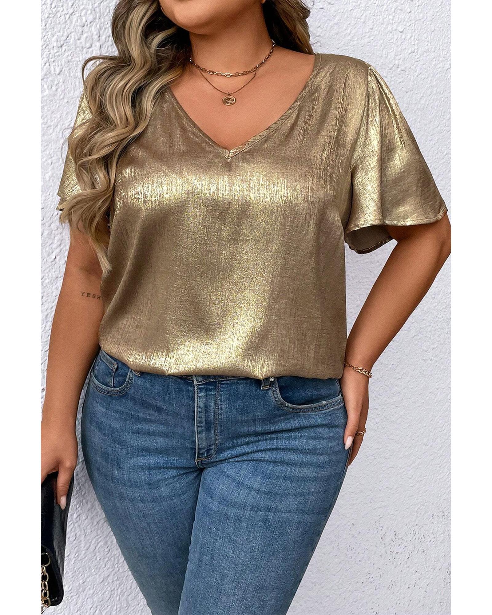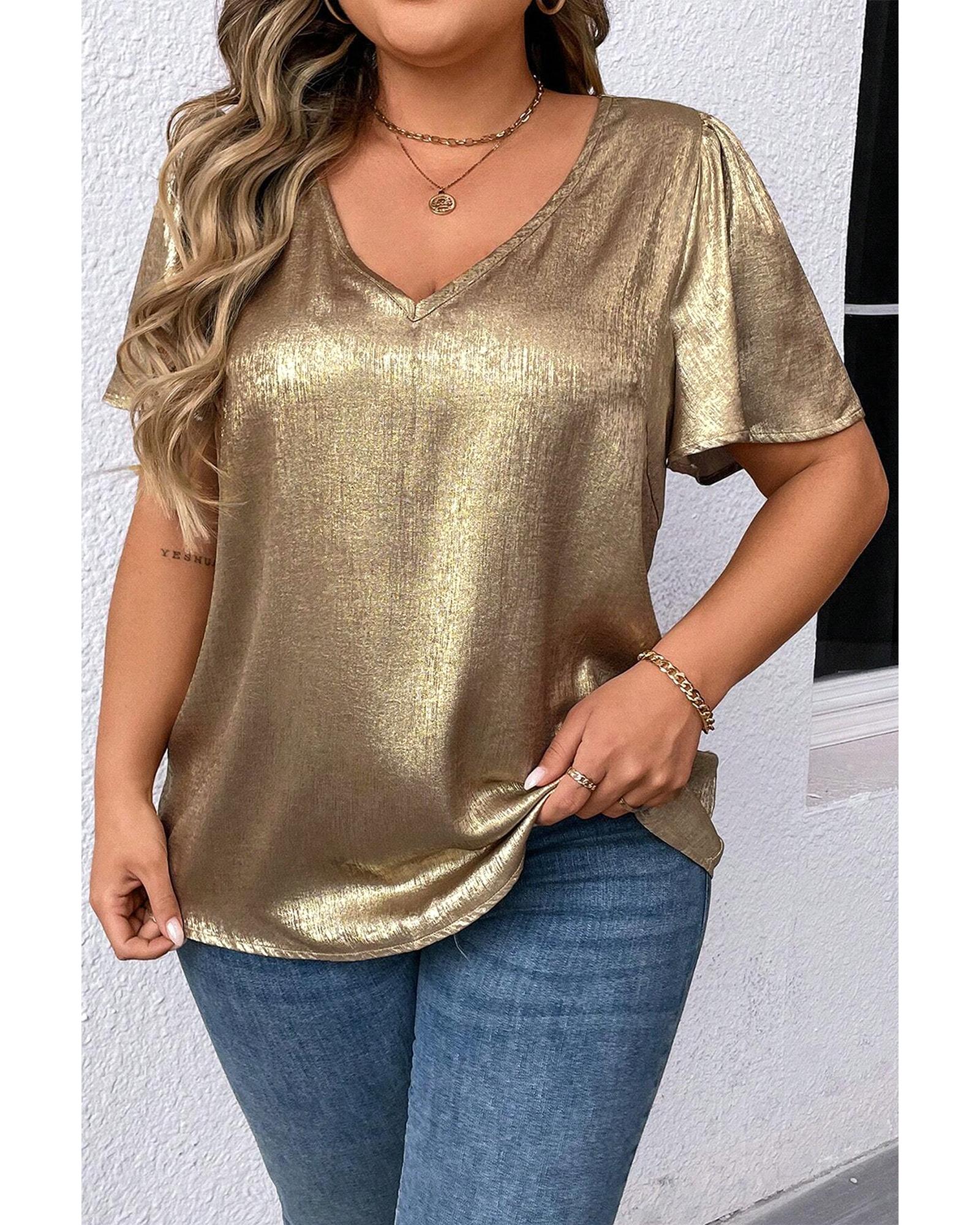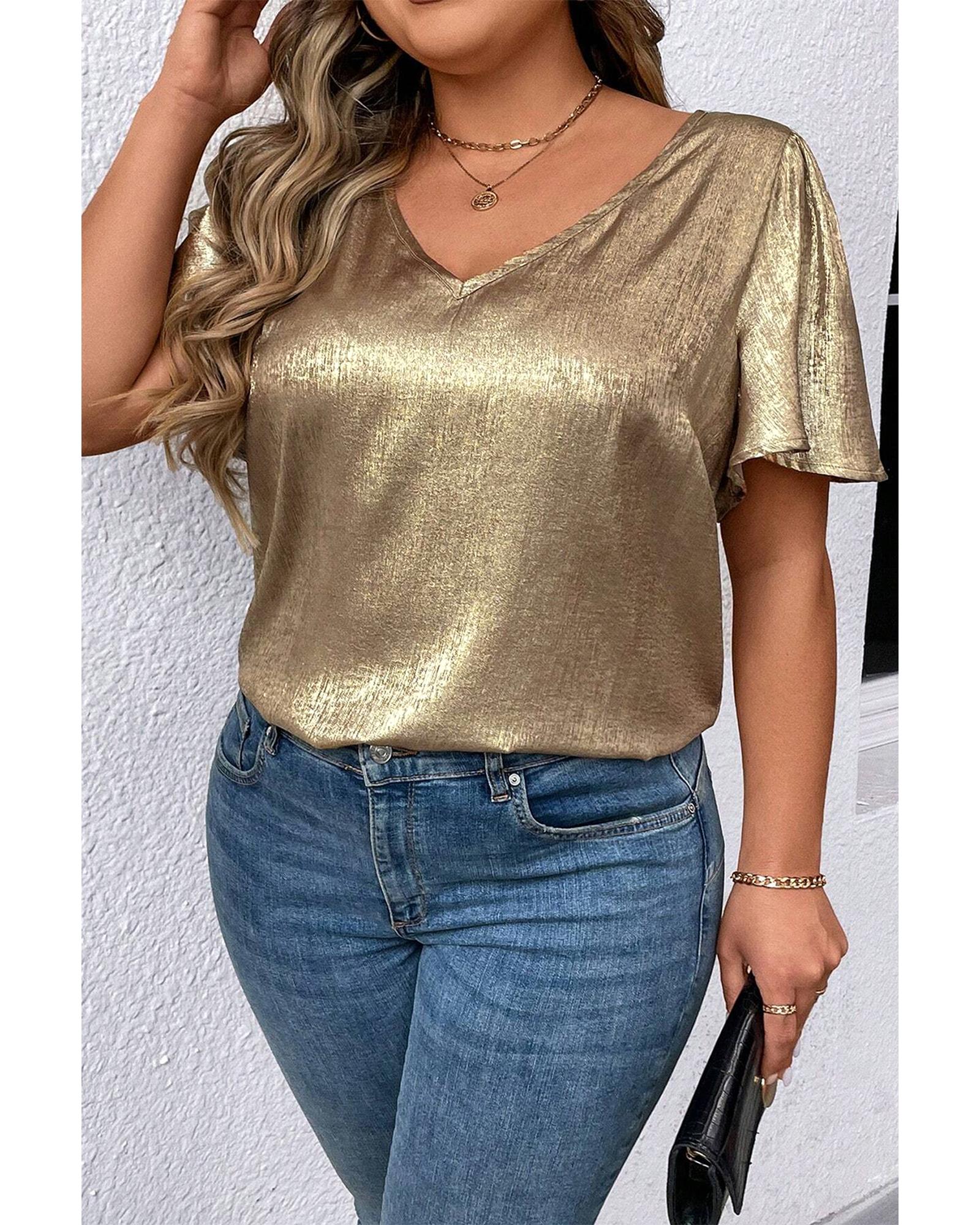 Gold Plus Size Metallic V Neck Short Sleeve Blouse – 1X