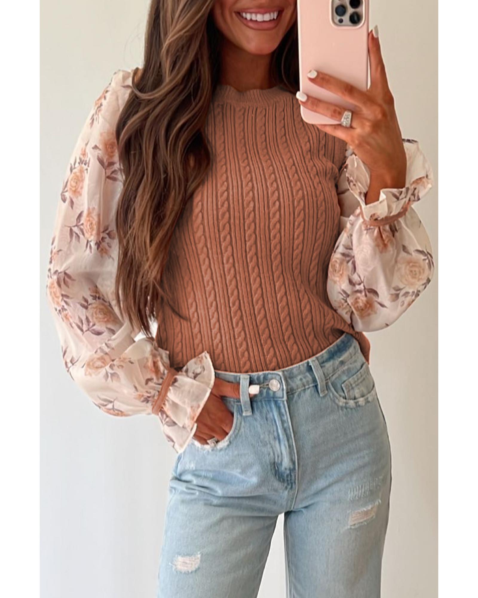 Golden Fleece Floral Patchwork Ruffled Cuff Cable Knit Sweater – S