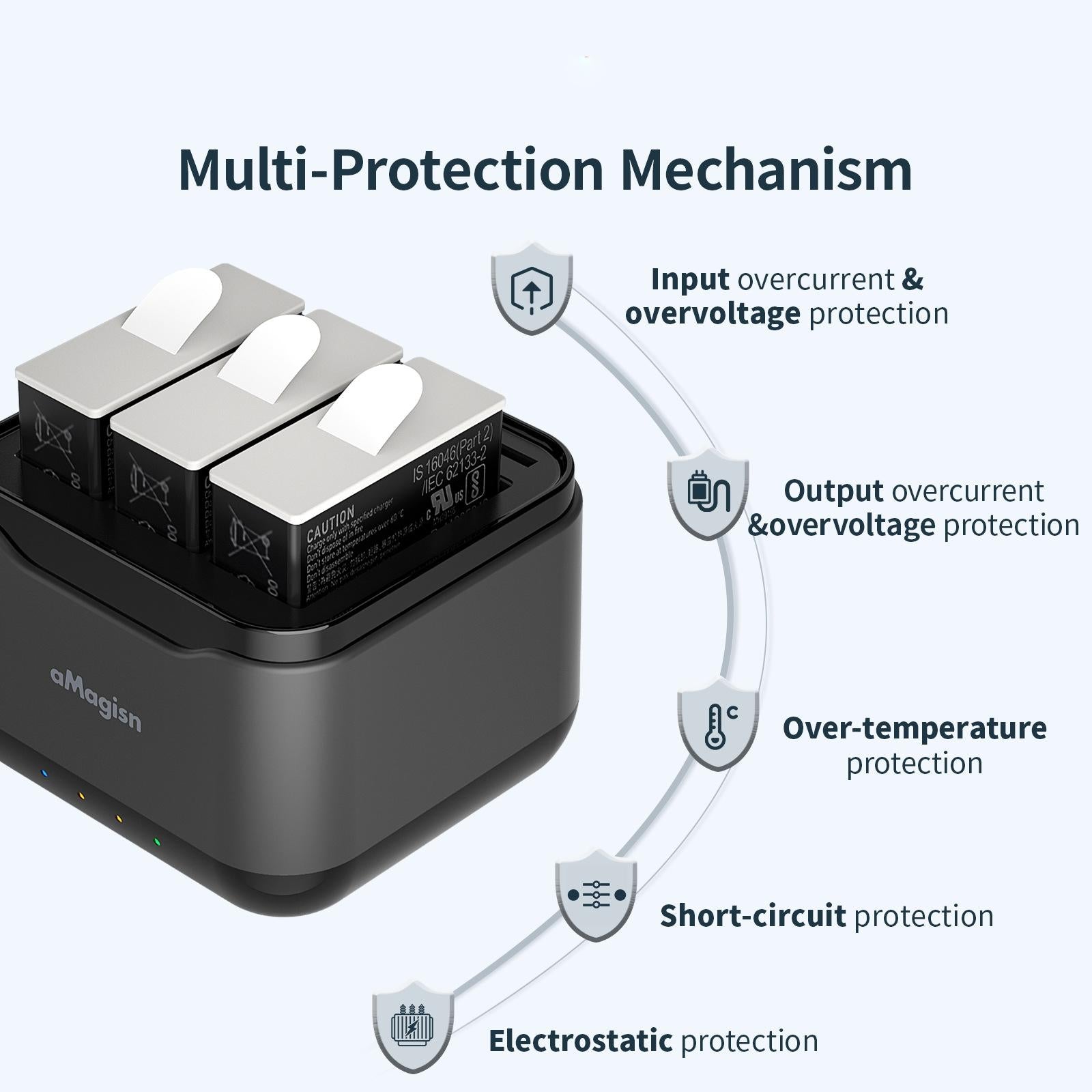 • Individually powered, triple-connected charging slots for charging three batteries at the same time at maximum power