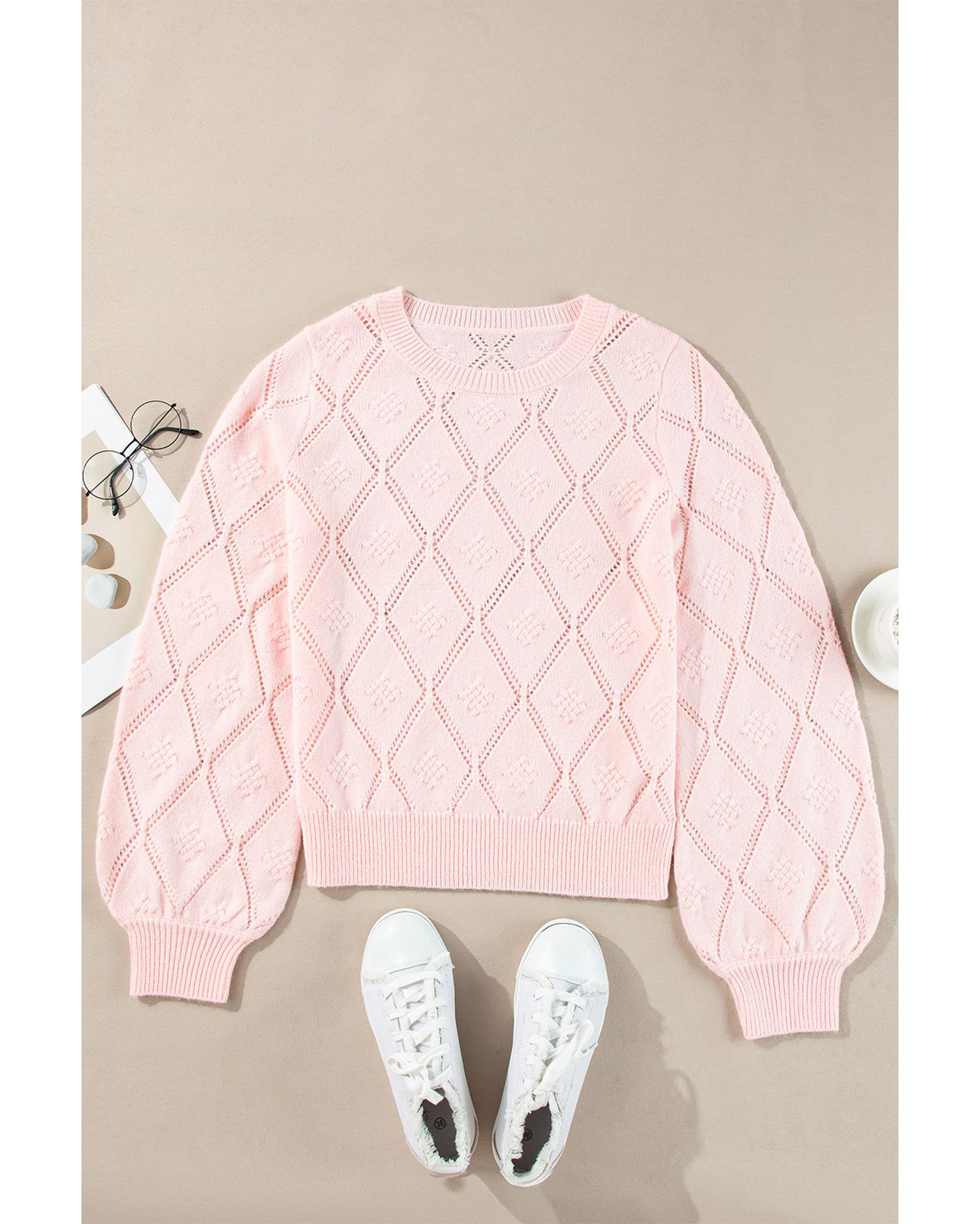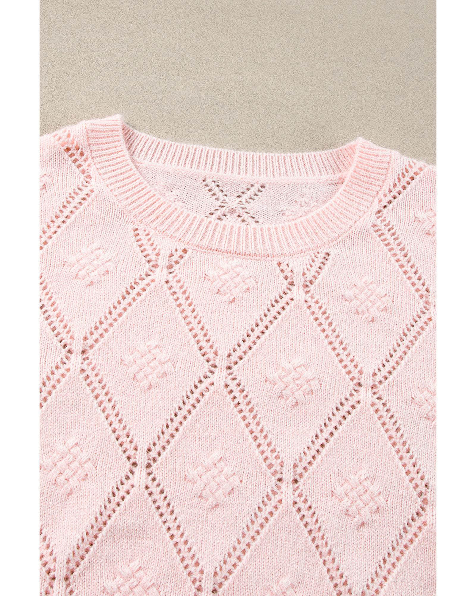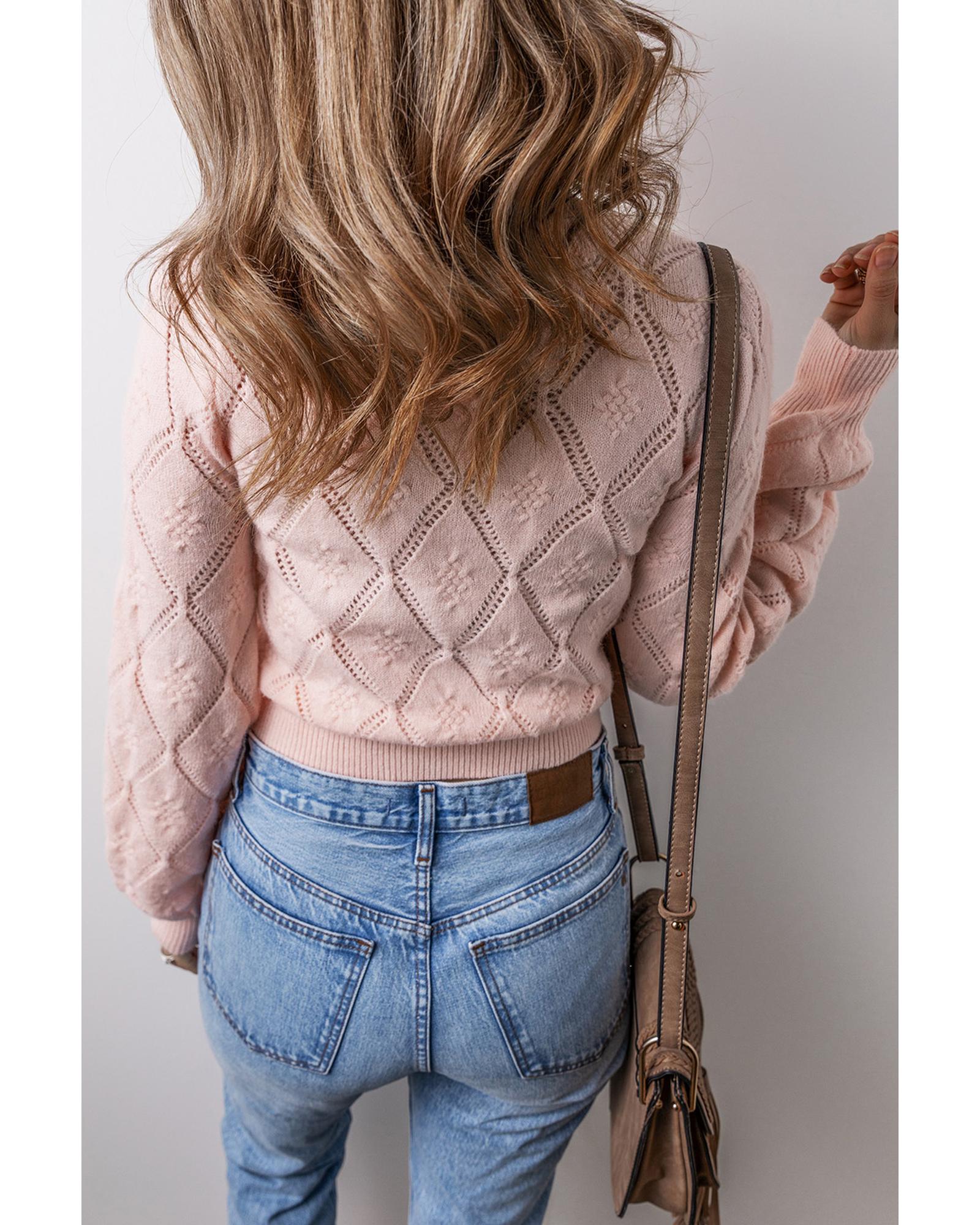 Gossamer Pink Openwork Plaid Puff Sleeve Cropped Sweater – XL
