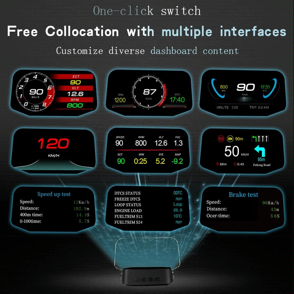 • Displays vehicle speed, rotation speed, water temperature, voltage, mileage, driving time, fuel consumption, local time, oil temperature, driving direction, number of satellites, turbo pressure, air-fuel ratio, intake pressure, acceleration test, brake test, and 100 kilometers acceleration test.