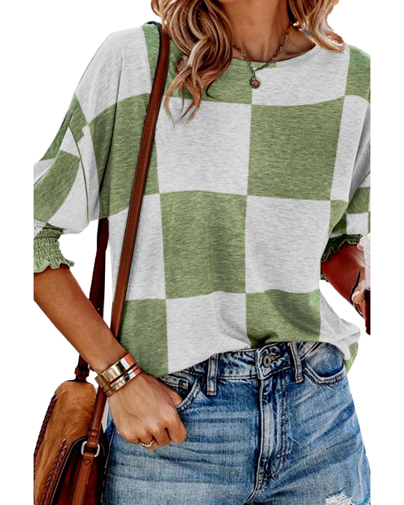 Grass Green Mix Checkered Print Shirred Cuffs Blouse – XL