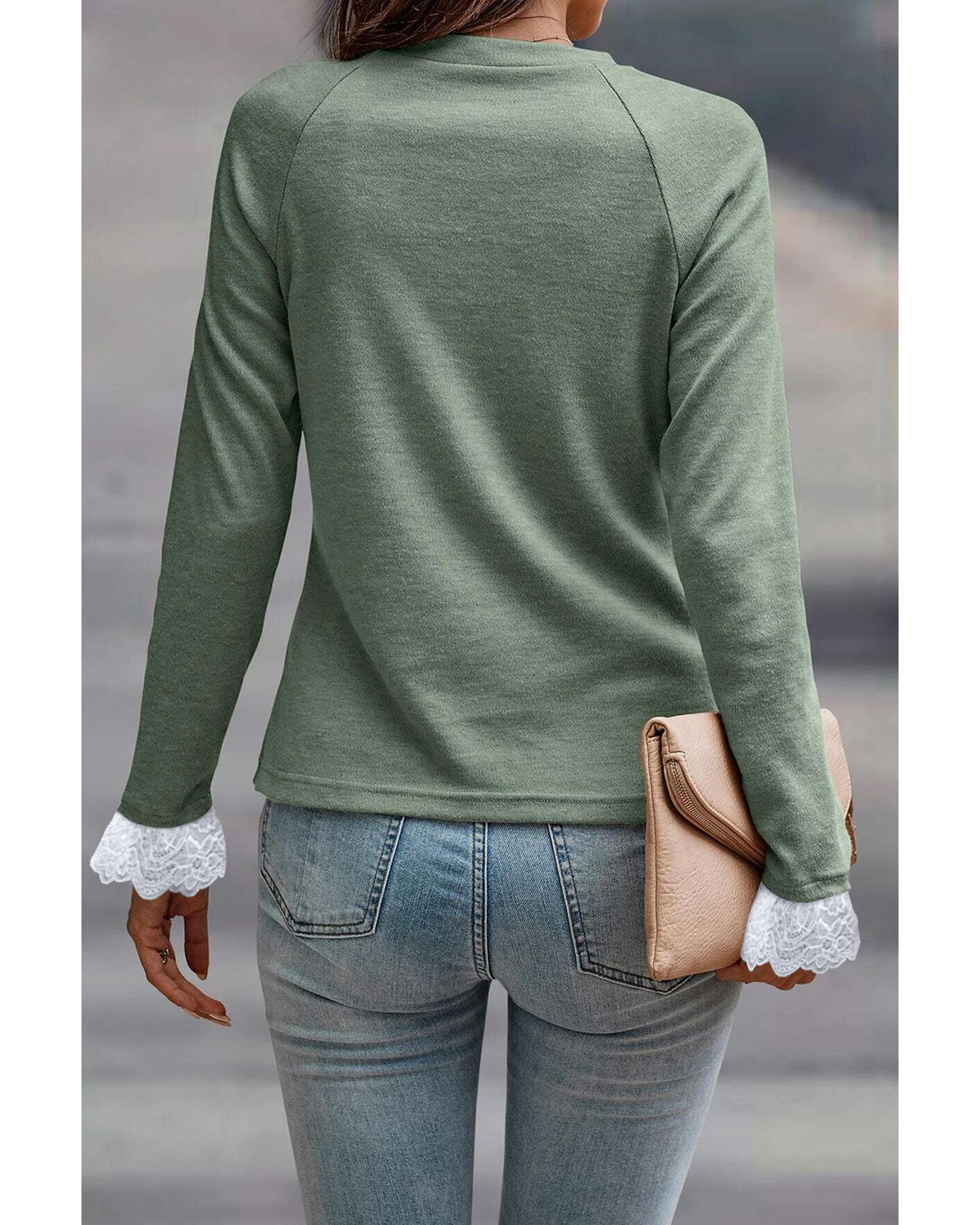 Grass Green Seam Detail Lace Contrast Cuffs Raglan Sleeve Top – M