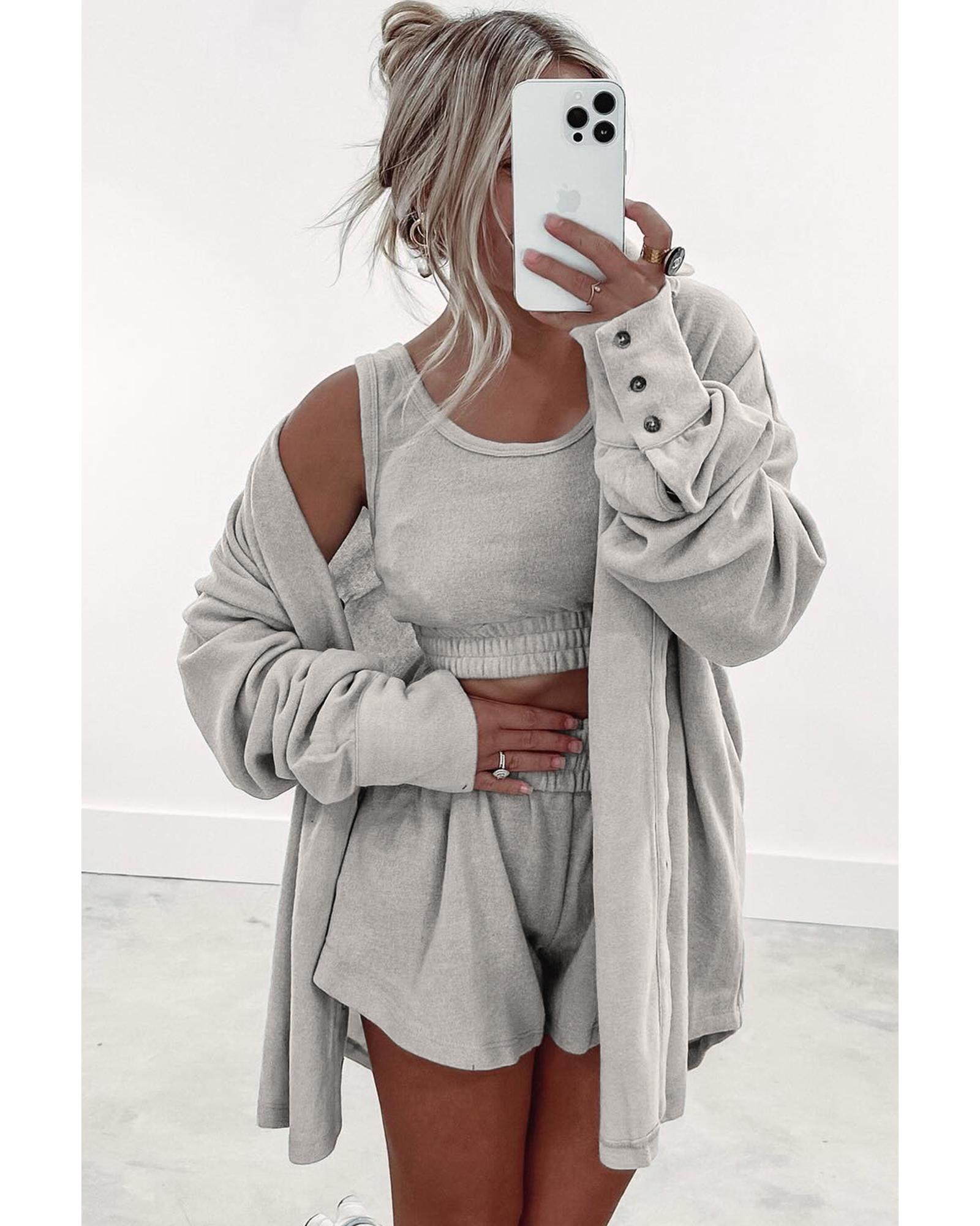 Gray 3 Pcs Crop Tank Top Shorts with Cardigan Lounge Set – S