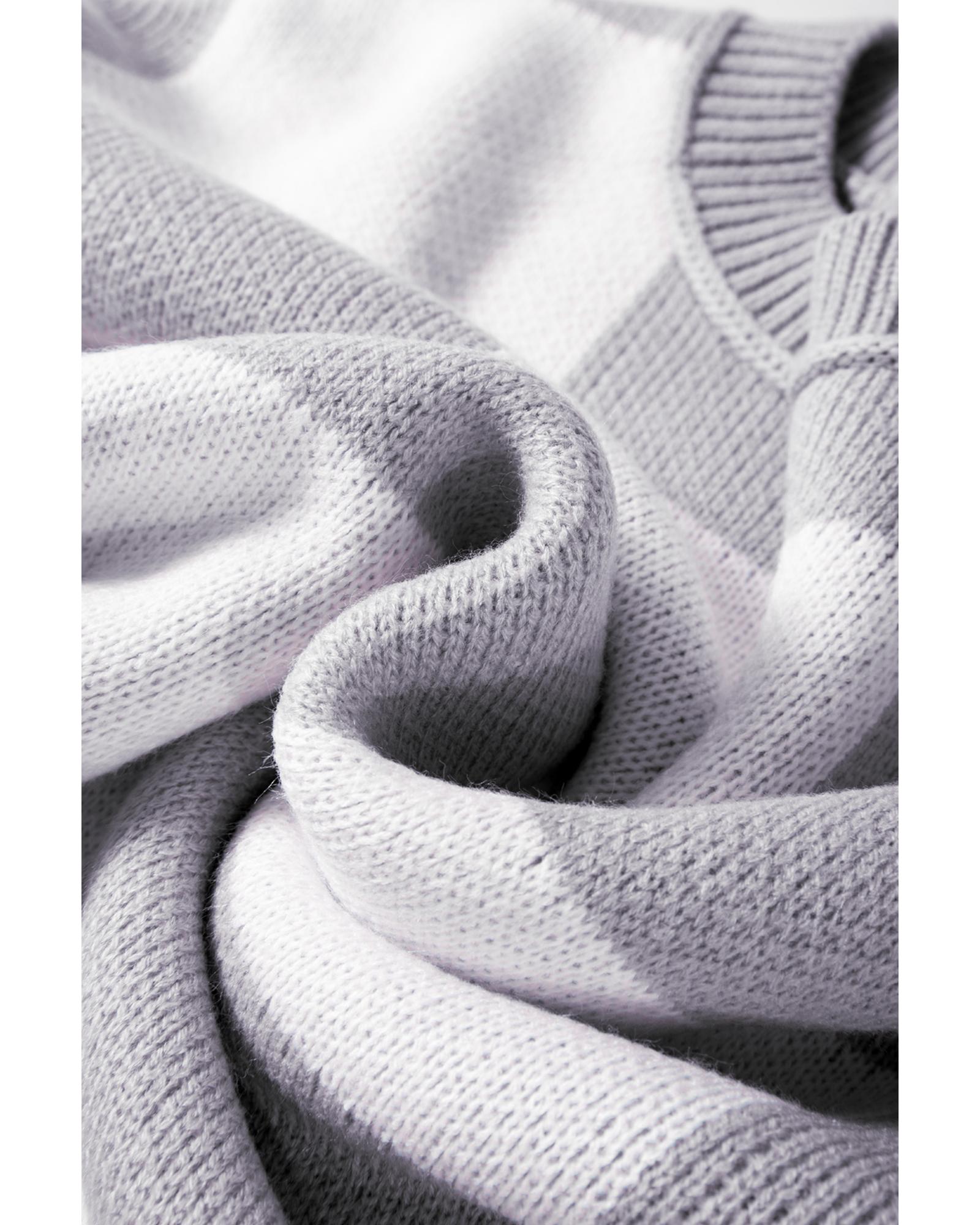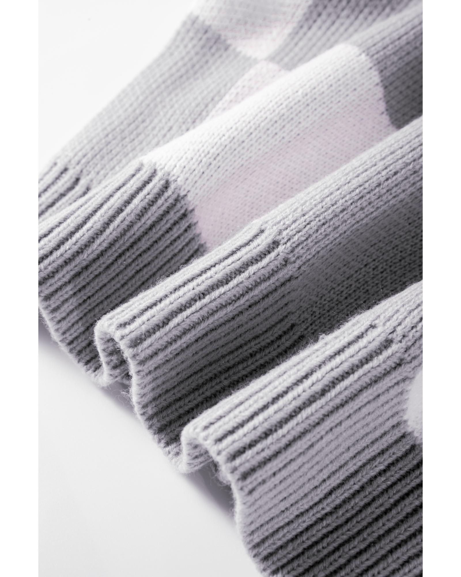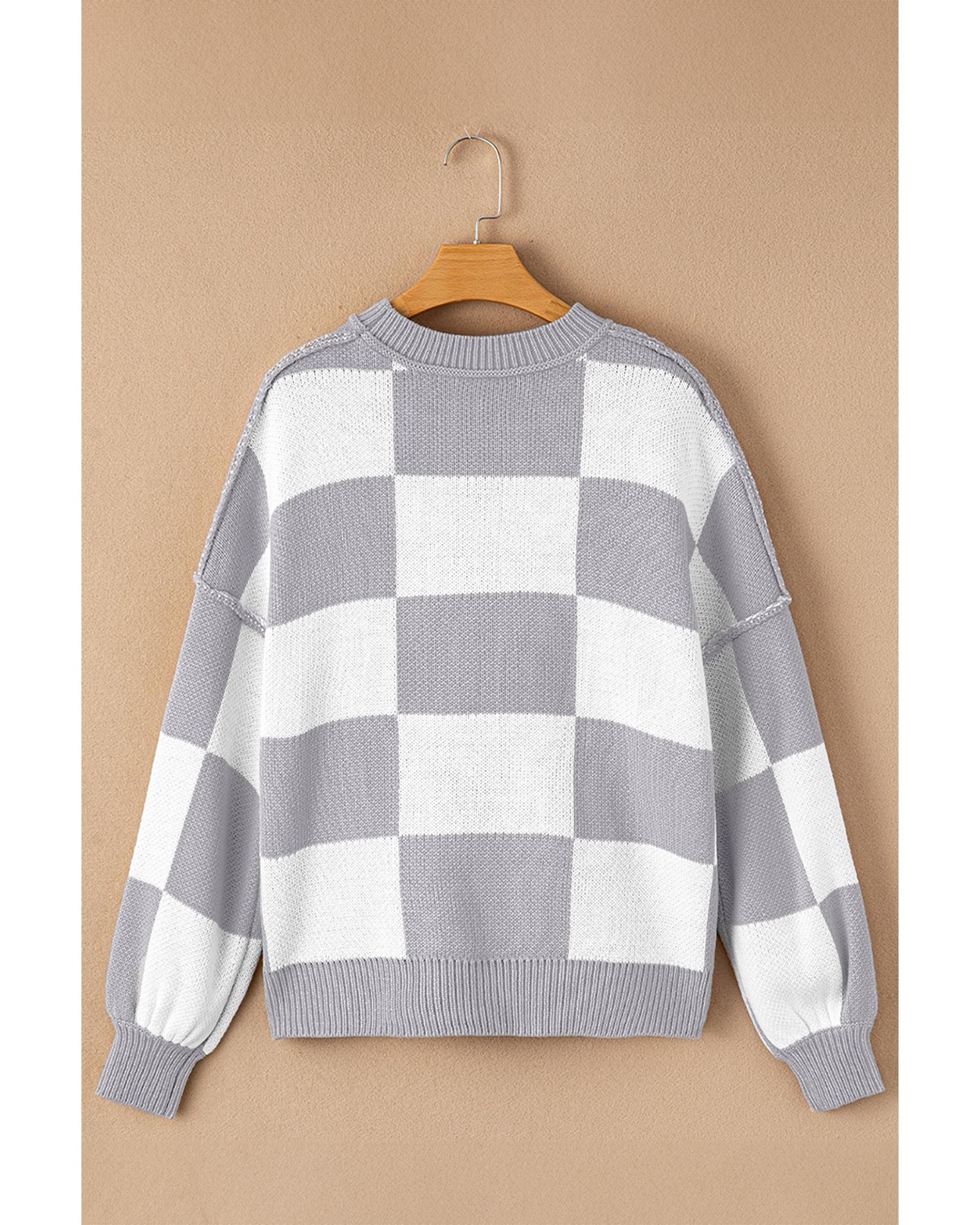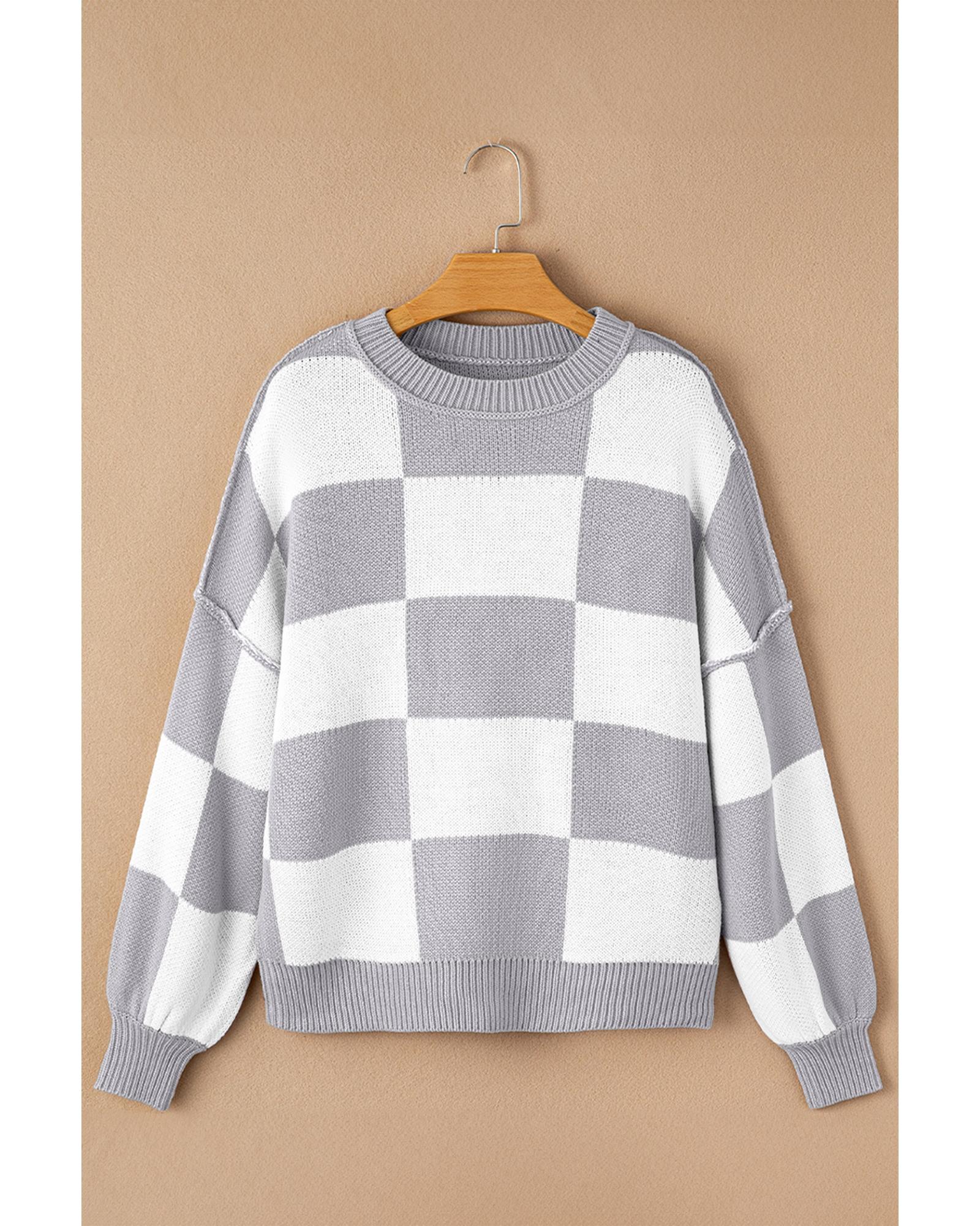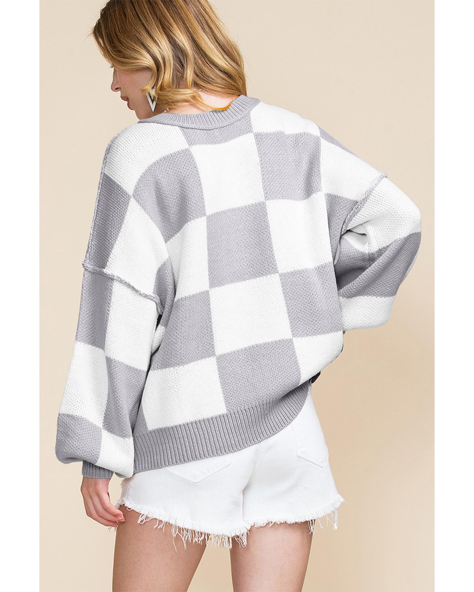- Stylish Gray Checkered Bishop Sleeve Sweater