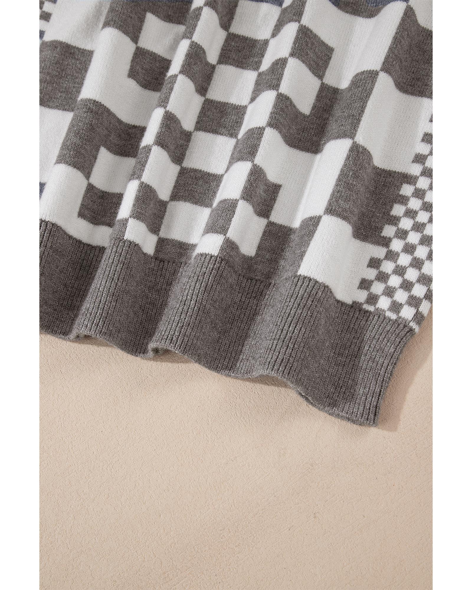 Gray Checkered Print Drop Shoulder Round Neck Sweater – M