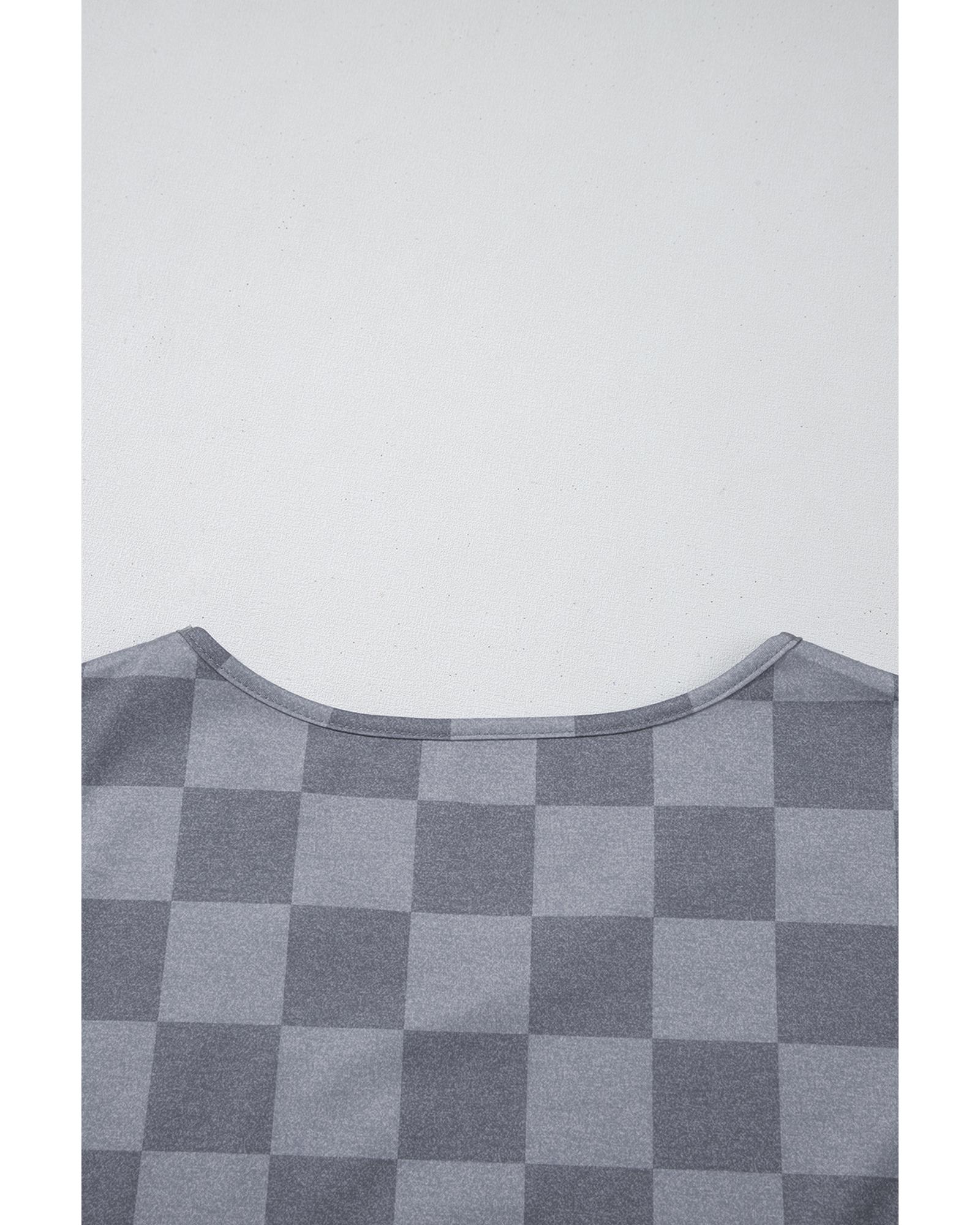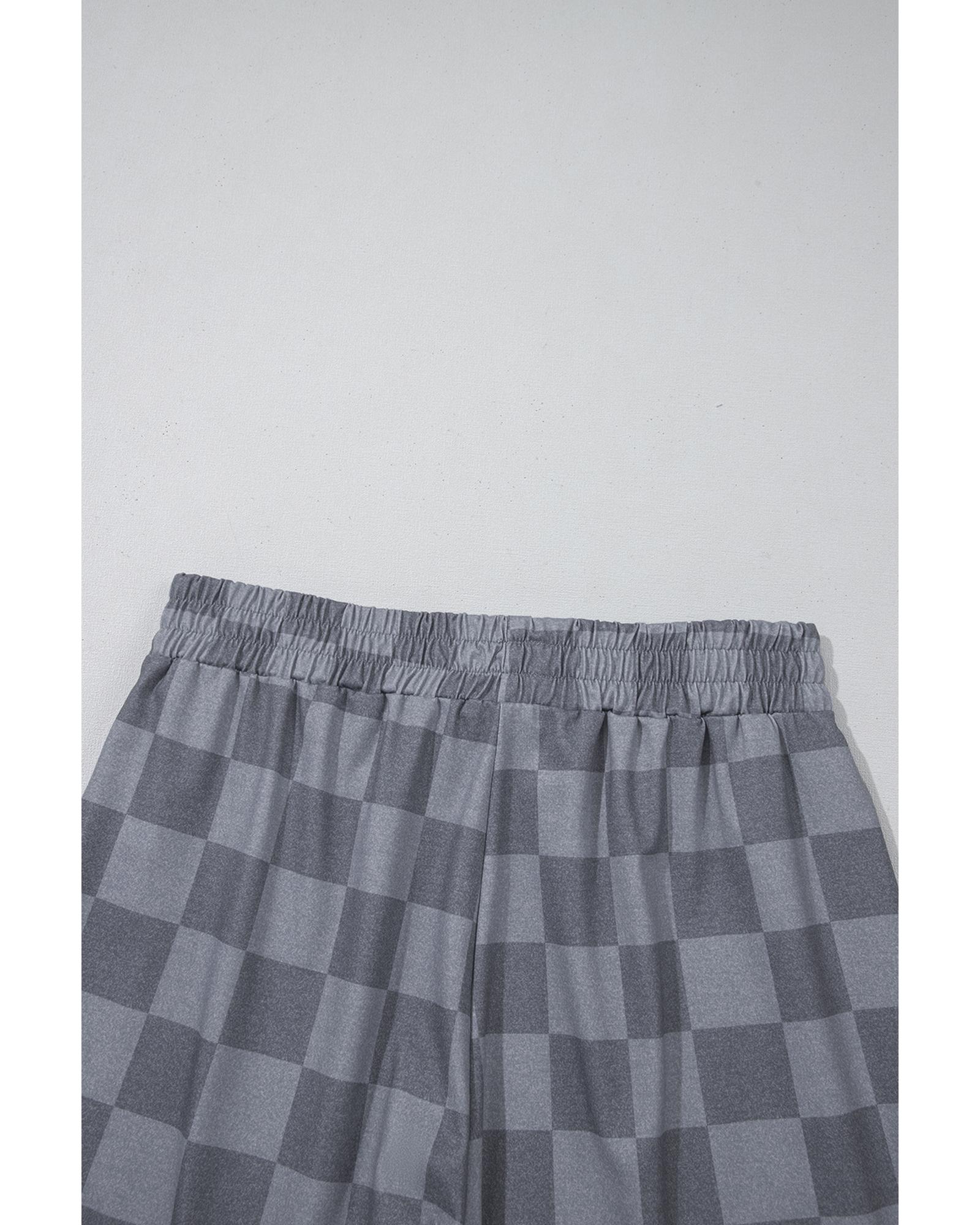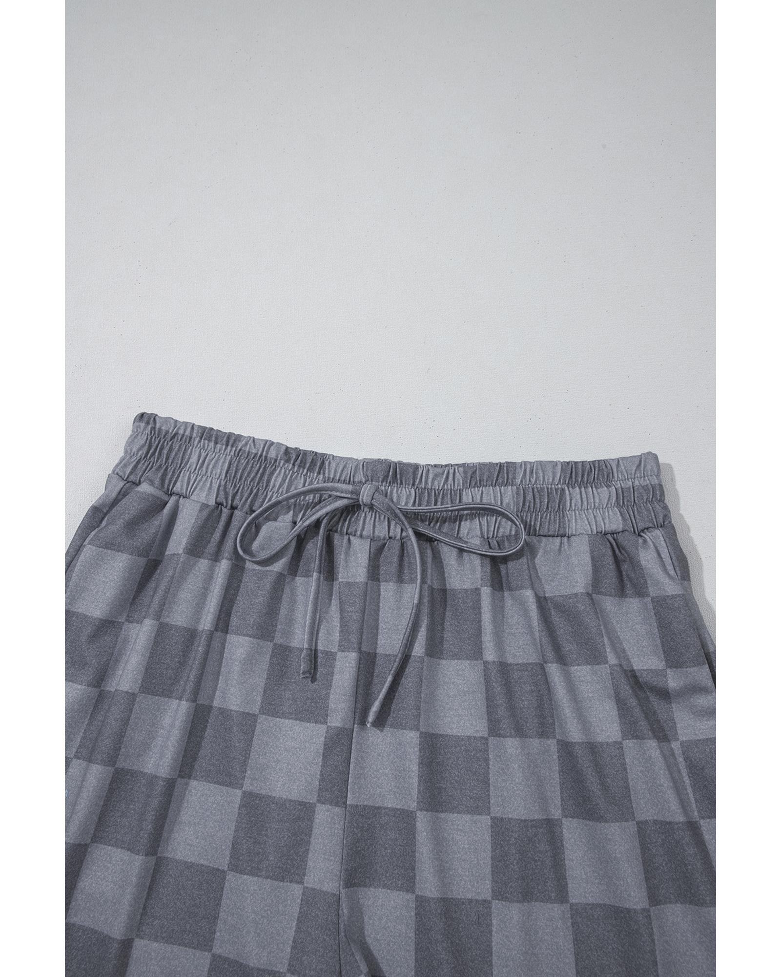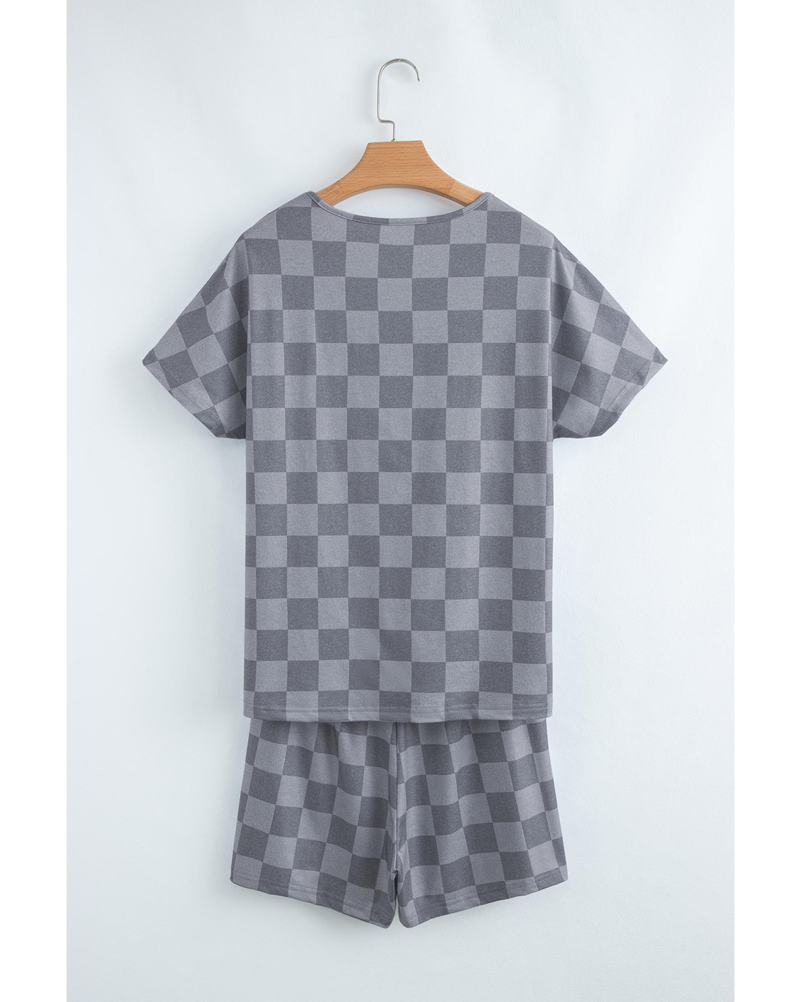 Gray Checkered V Neck Tee Drawstring Shorts Lounge Set – S