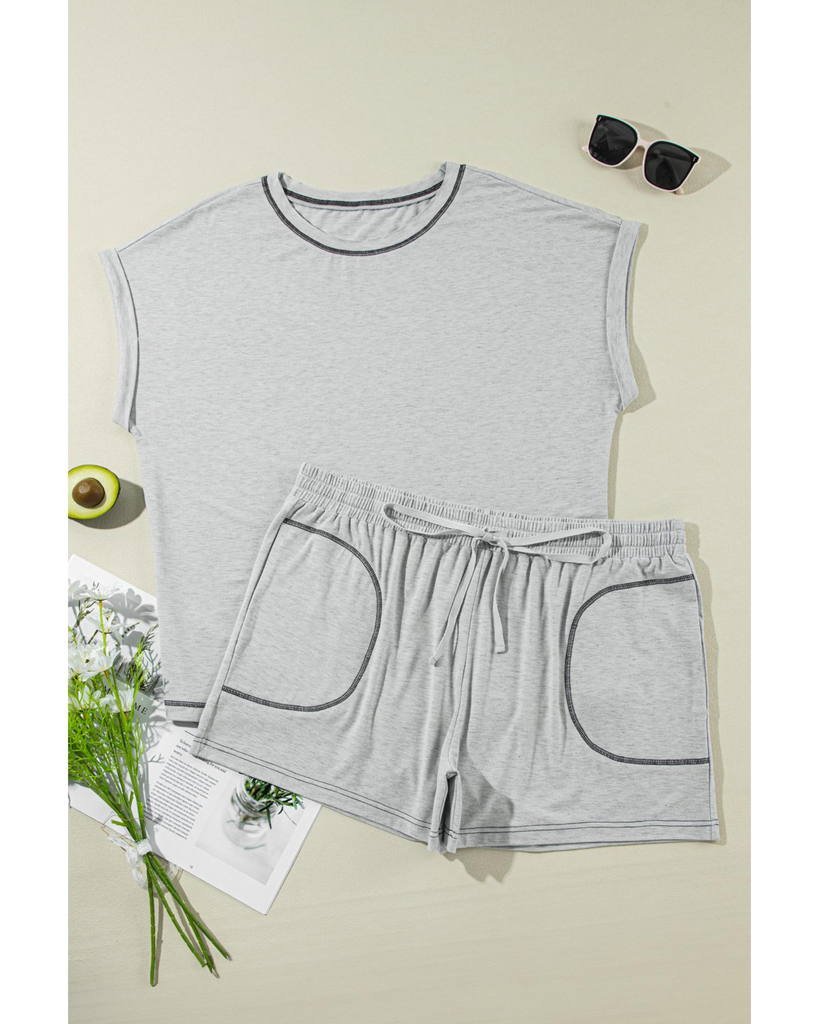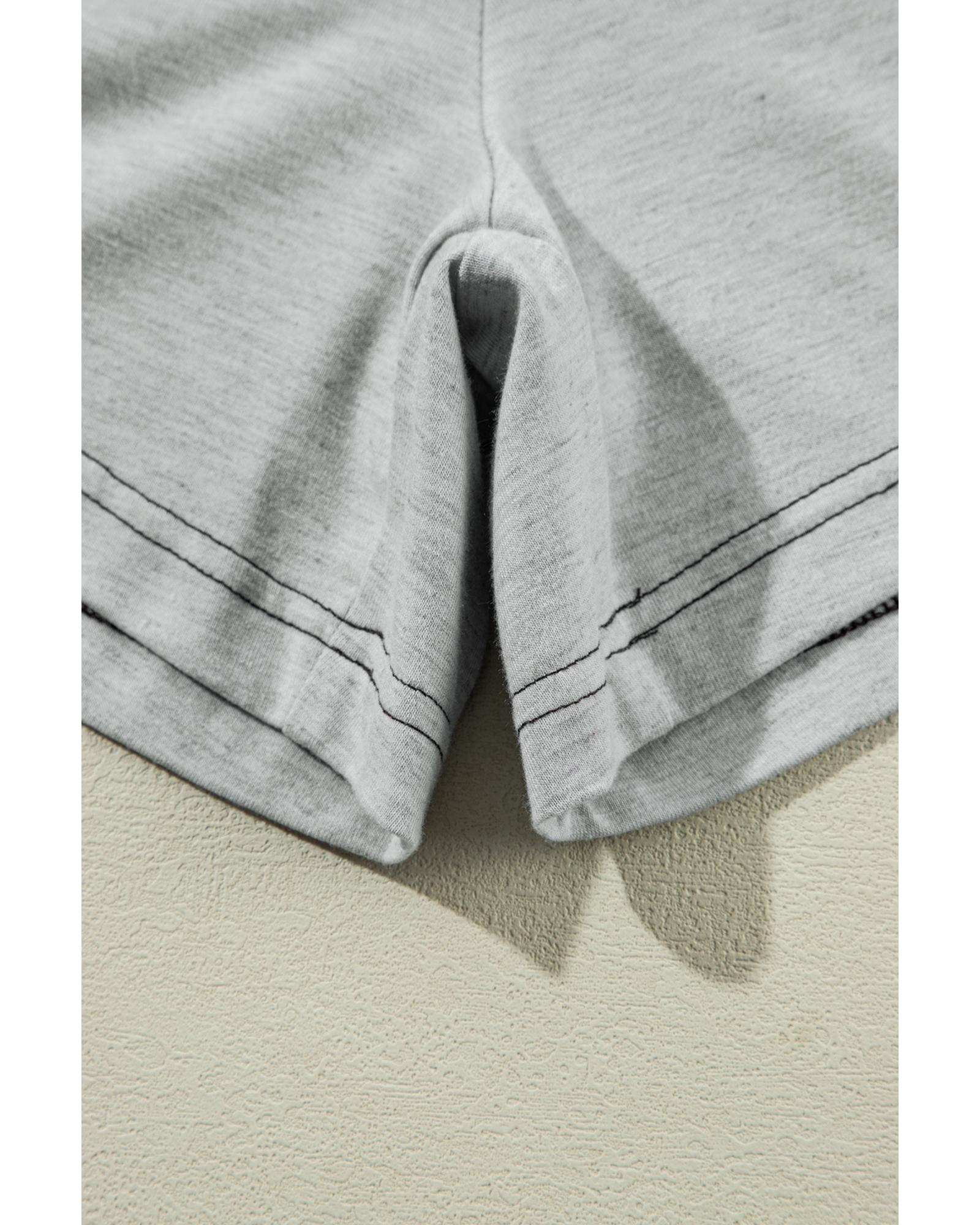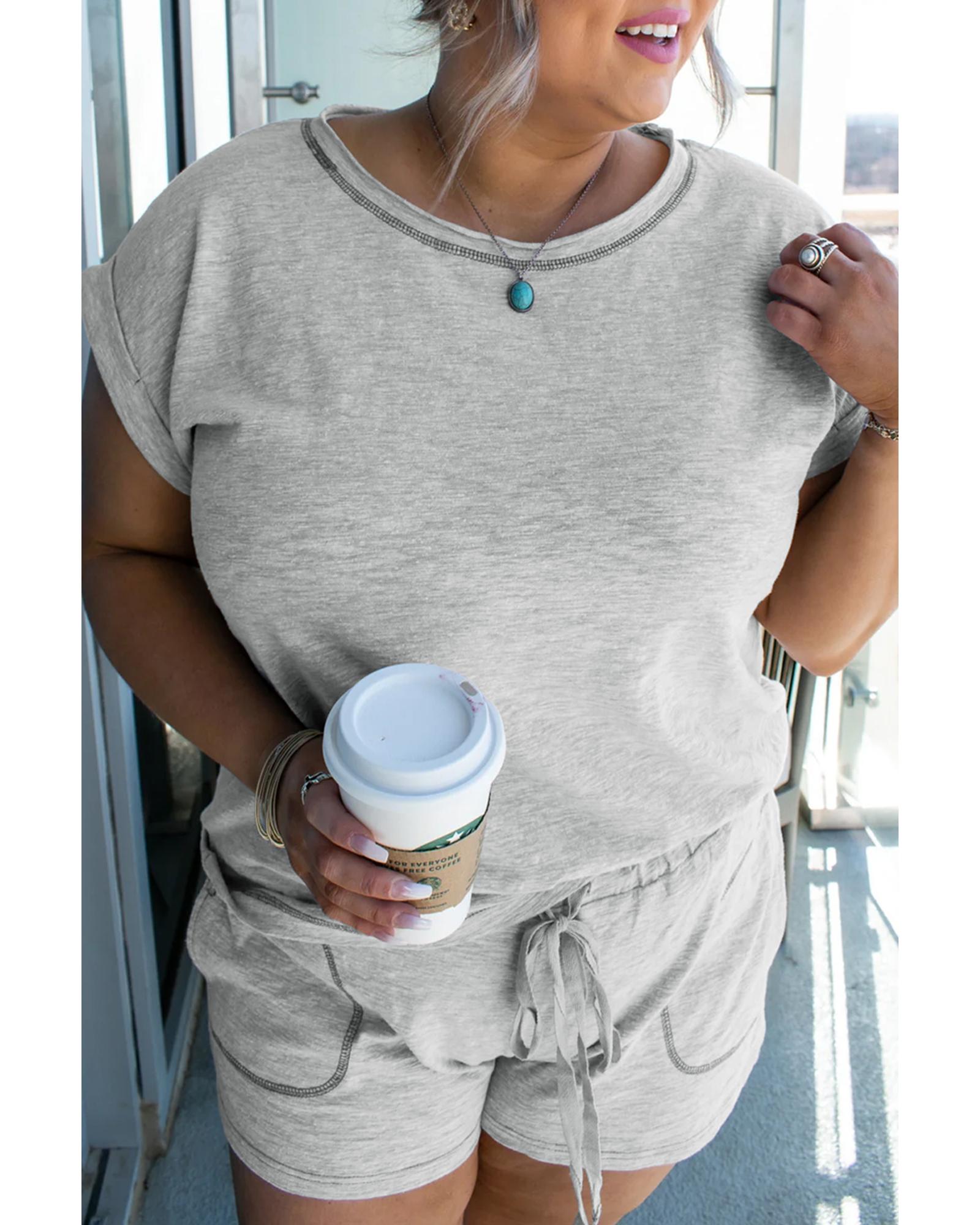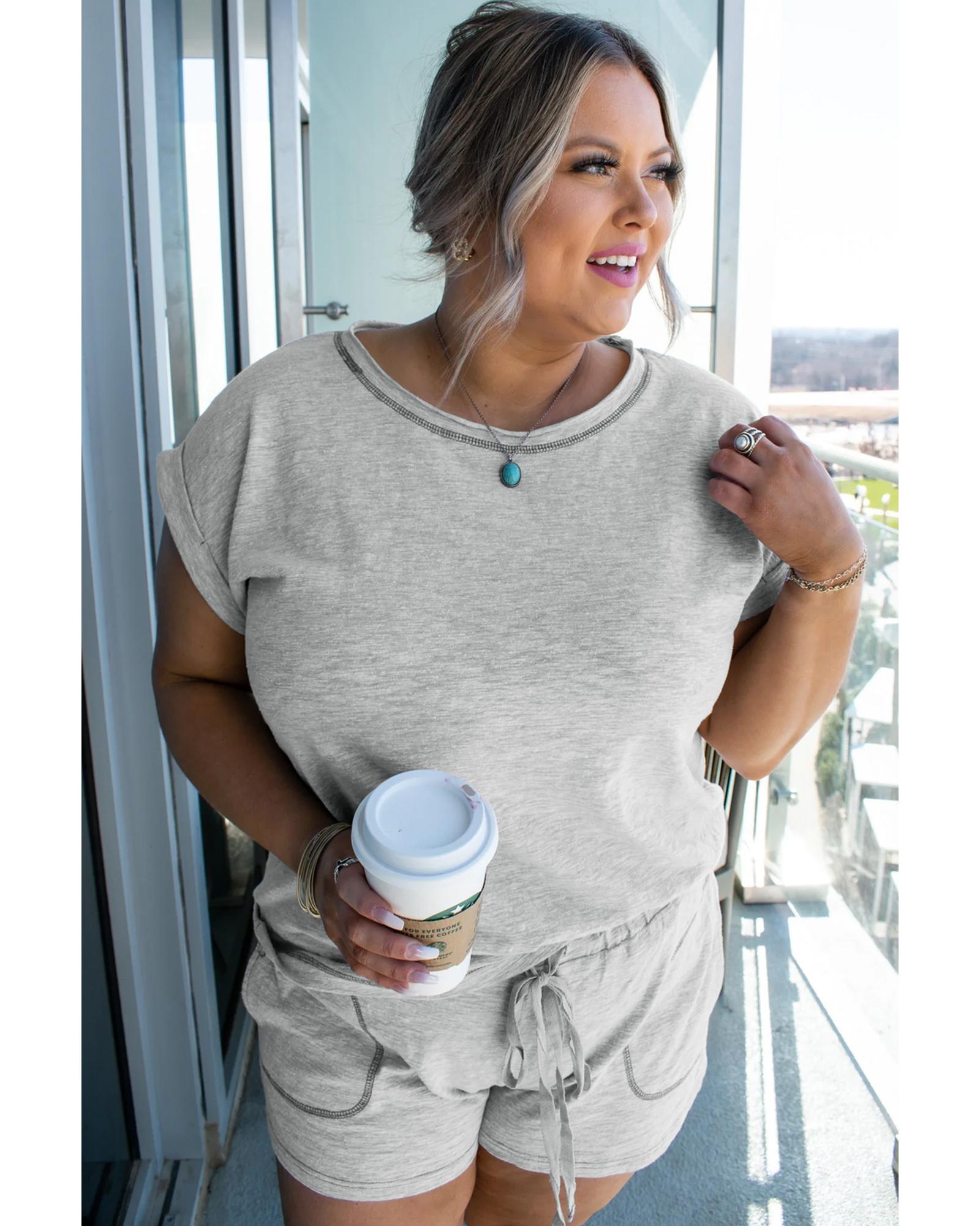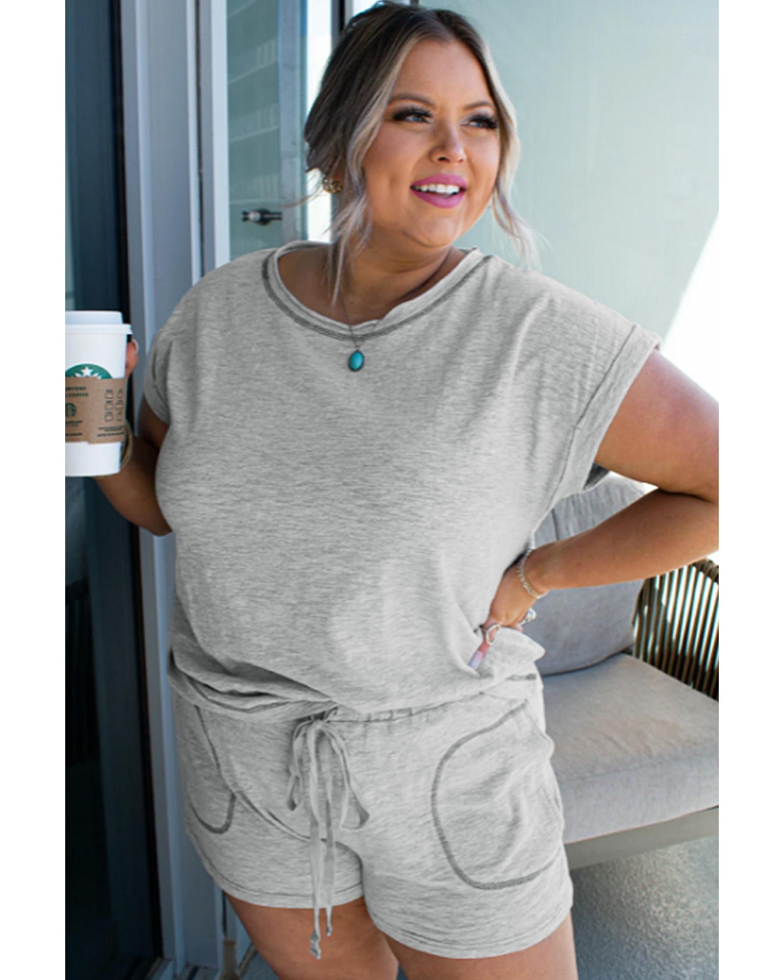 Gray Contrast Stitching Cuffed Sleeve Plus Shorts Set – 1X