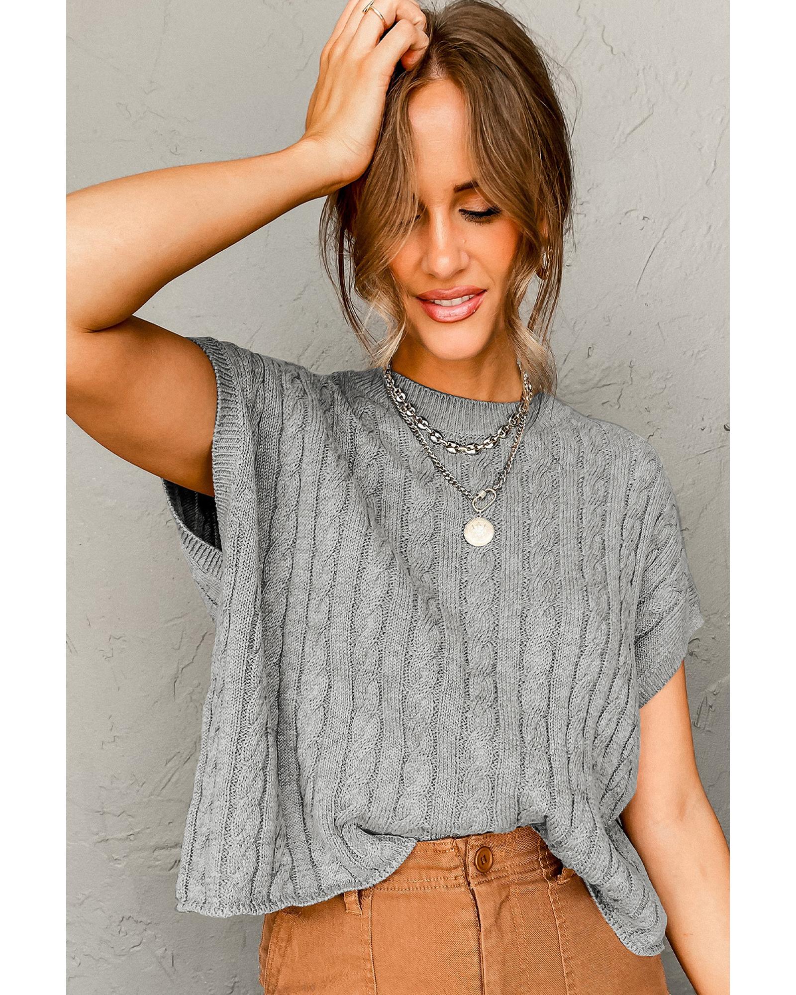 - Gray Crew Neck Cable Knit Short Sleeve Sweater
