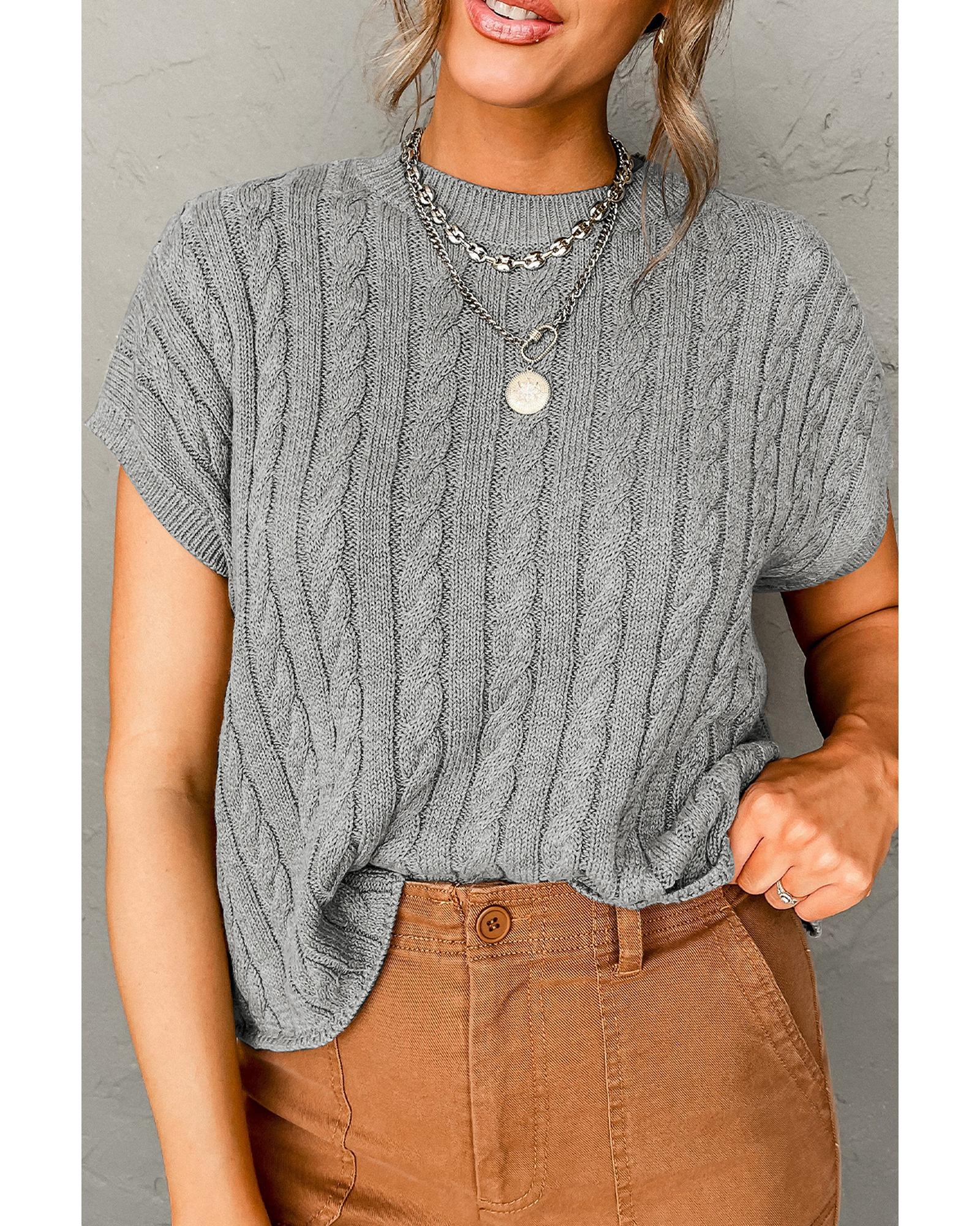 - Gray Crew Neck Cable Knit Short Sleeve Sweater