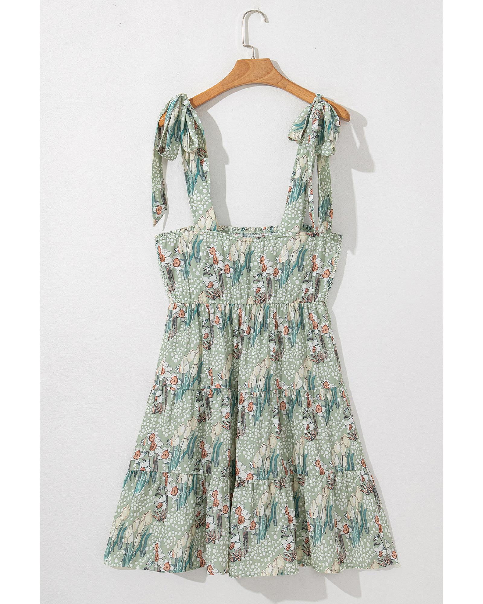 - Gray Floral Knotted Strap Smocked Tiered Ruffle Mini Dress