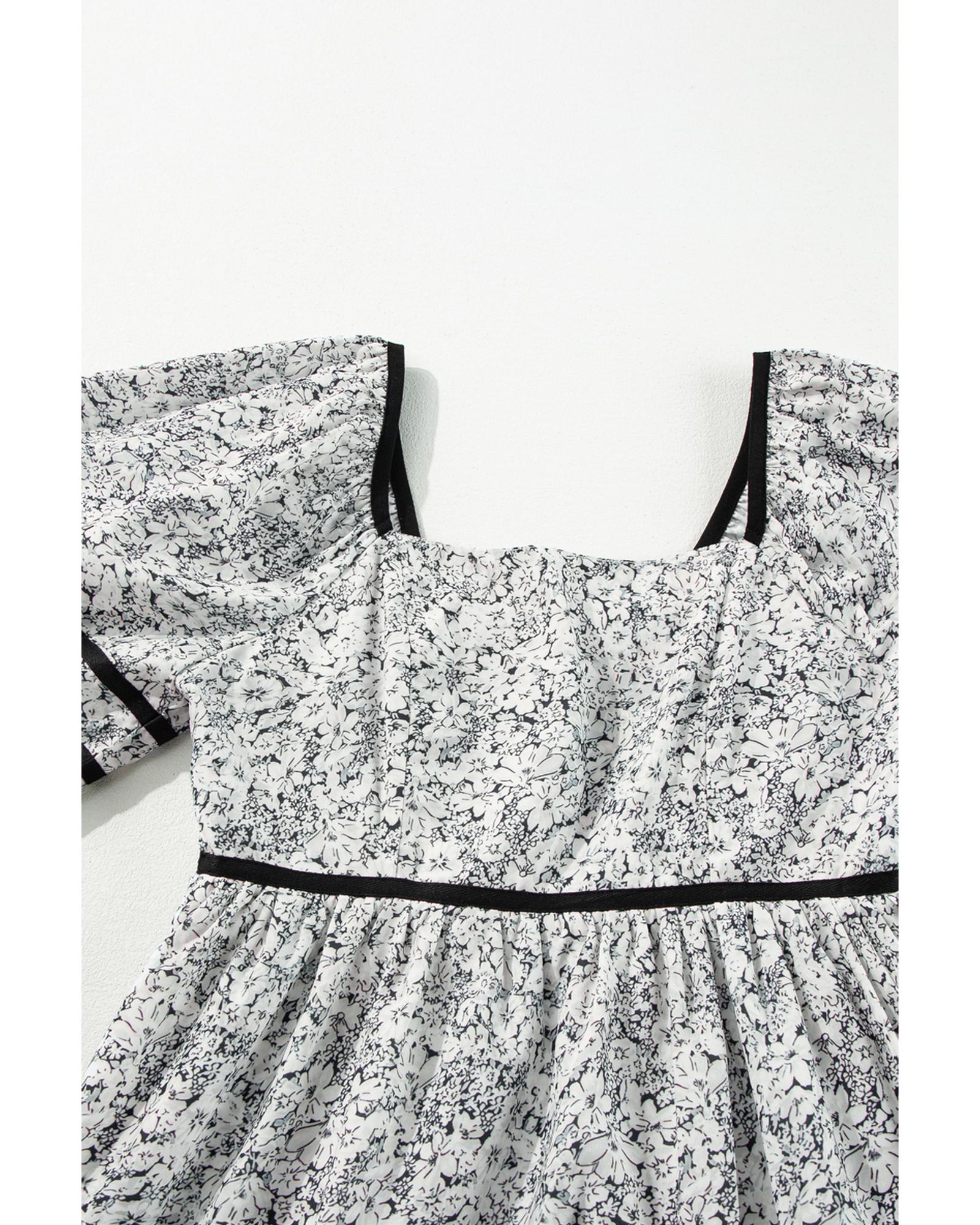 Gray Floral Print Open Back Balloon Sleeve Square Neck Mini Dress – S