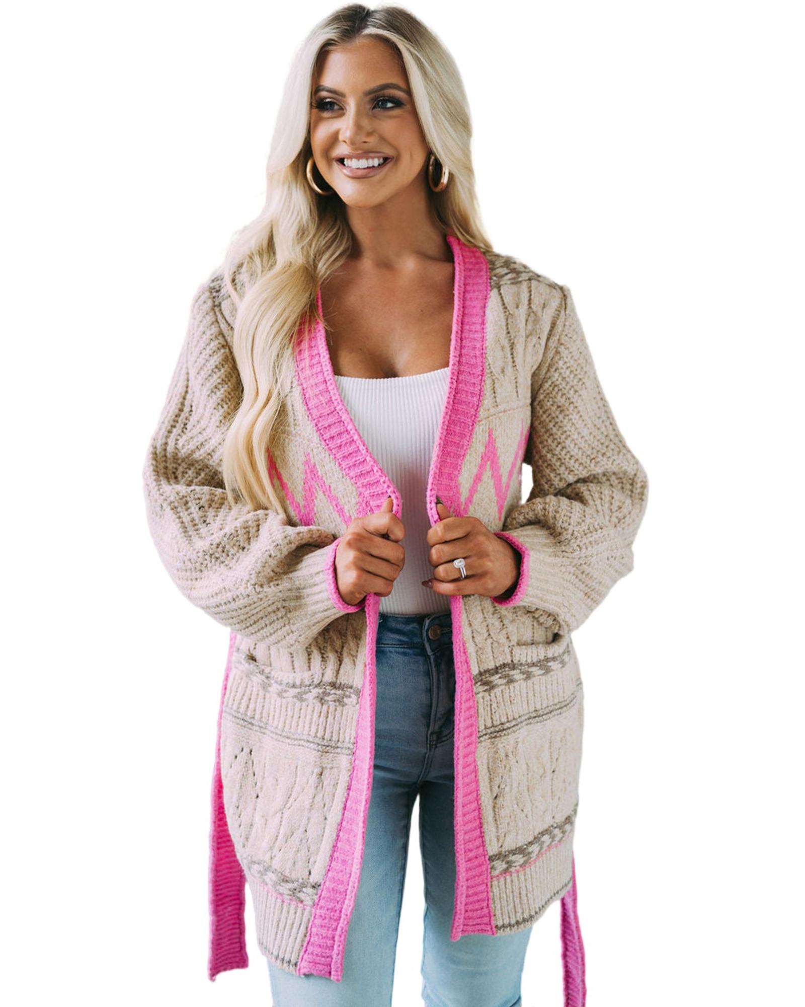 Gray Geometric Cable Knit Pocketed Open Front Cardigan – S
