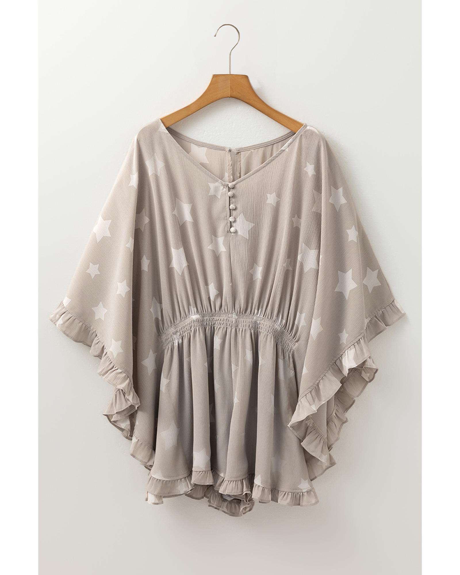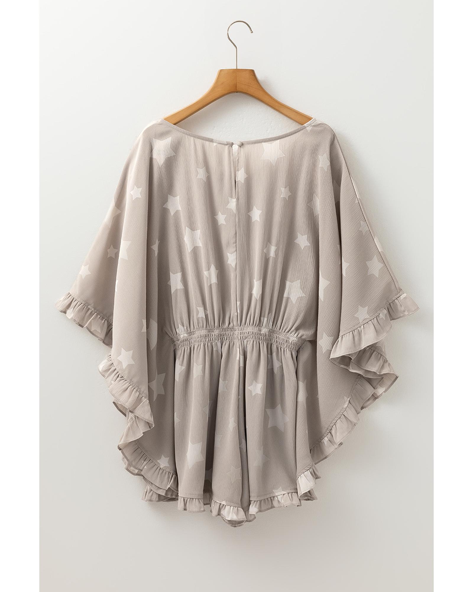 Gray Star Print Crinkle Textured Kimono Ruffle Sleeve Romper – M