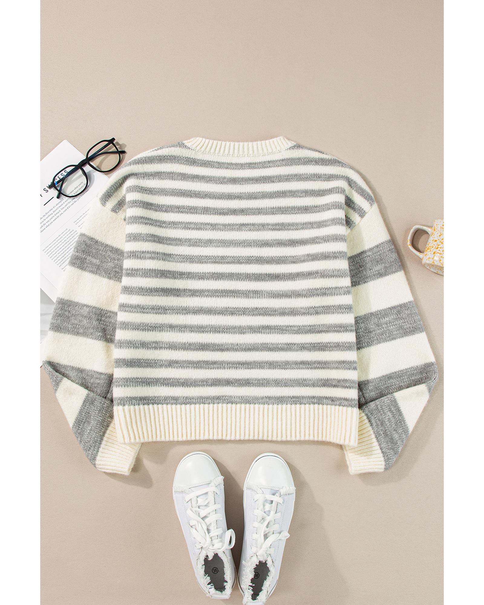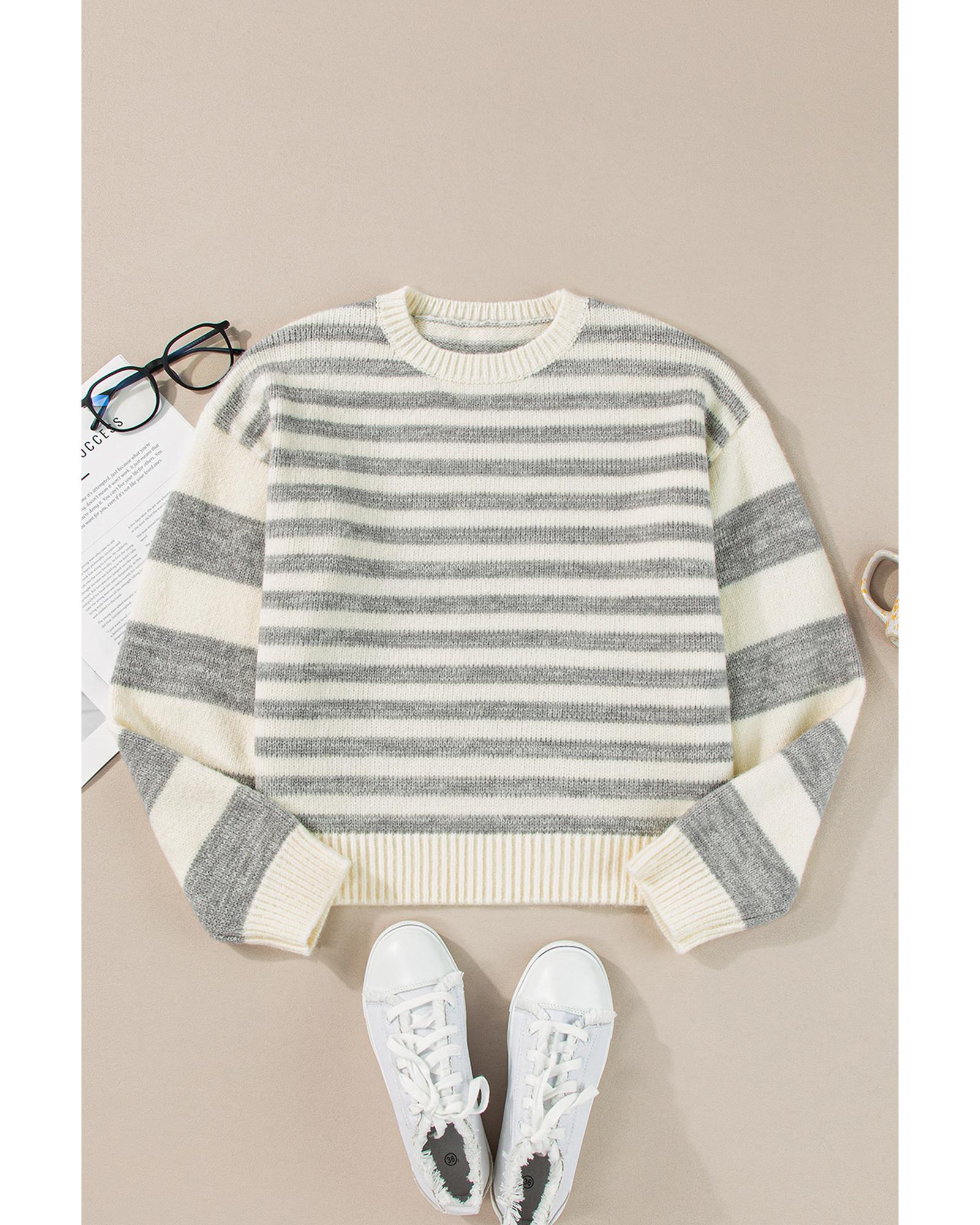 - Gray Stripe Drop Shoulder Crew Neck Sweater