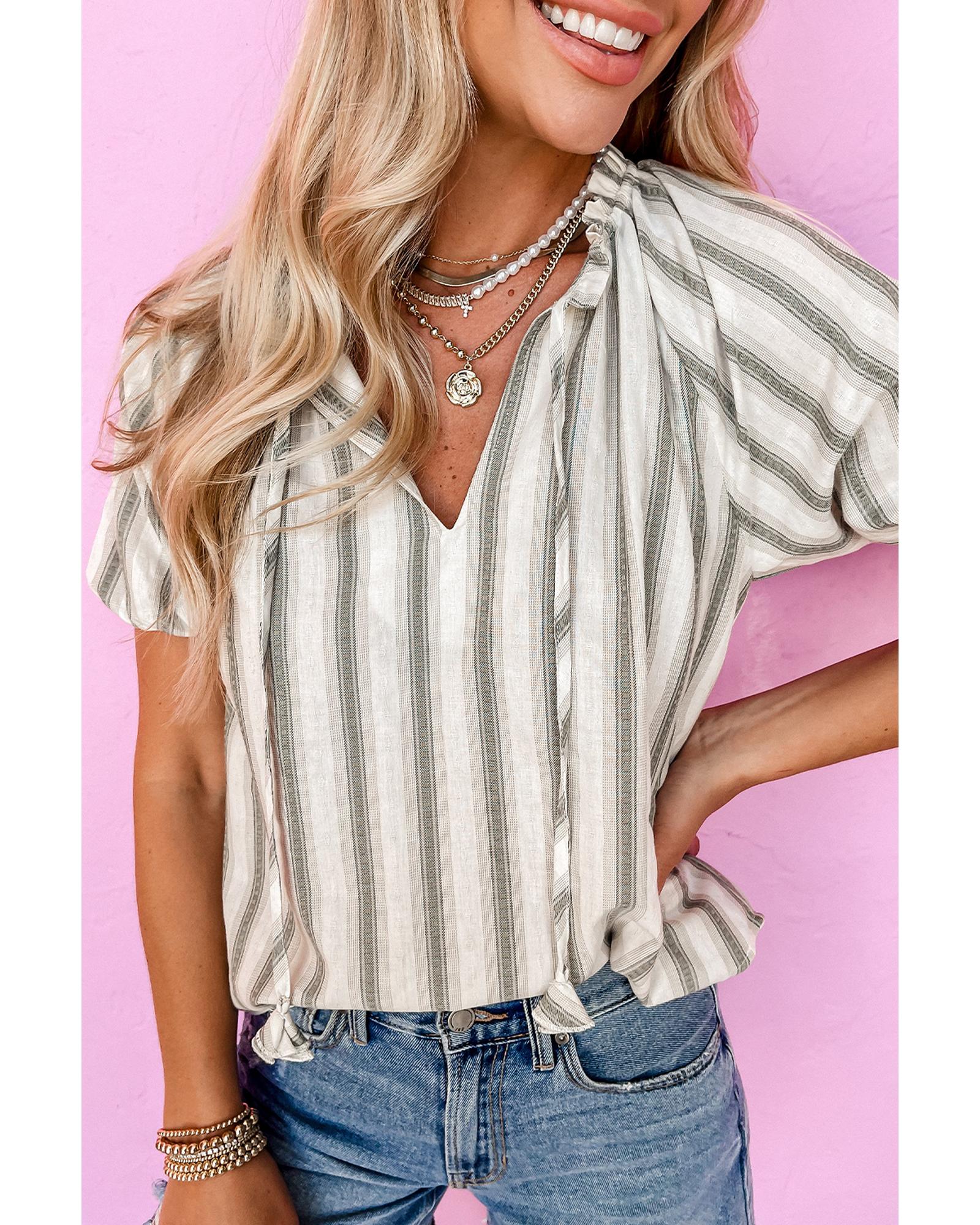 Gray Stripe Frilled Tie Neck Short Sleeve Blouse – L