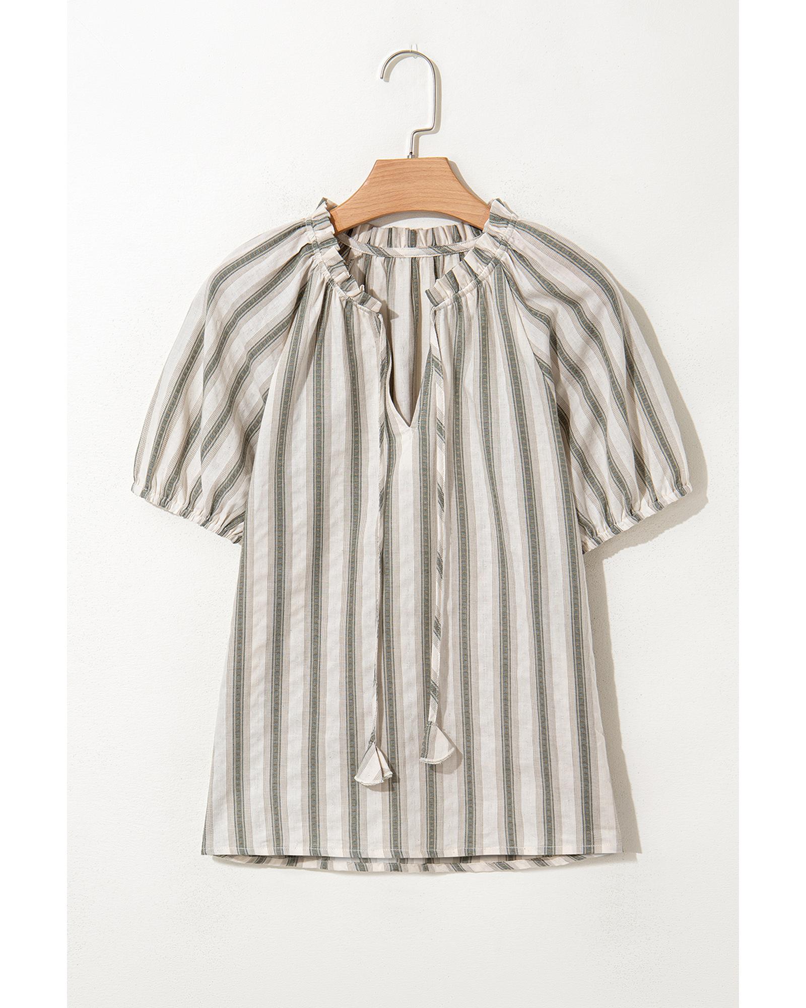 - Gray stripe frilled tie neck short sleeve blouse