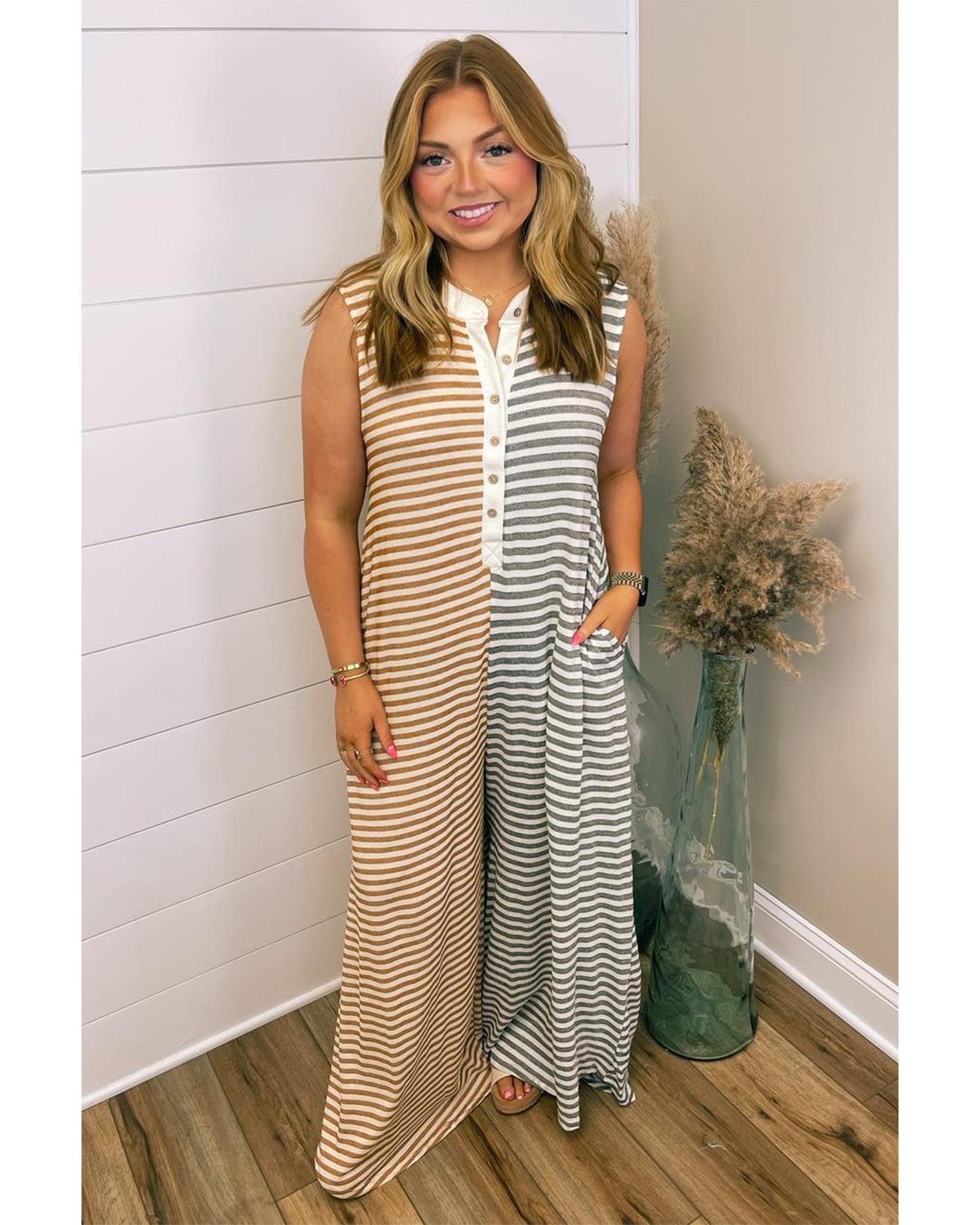 Gray Stripe Plus Size Color Block Buttoned Sleeveless Wide Leg Jumpsuit – 1X