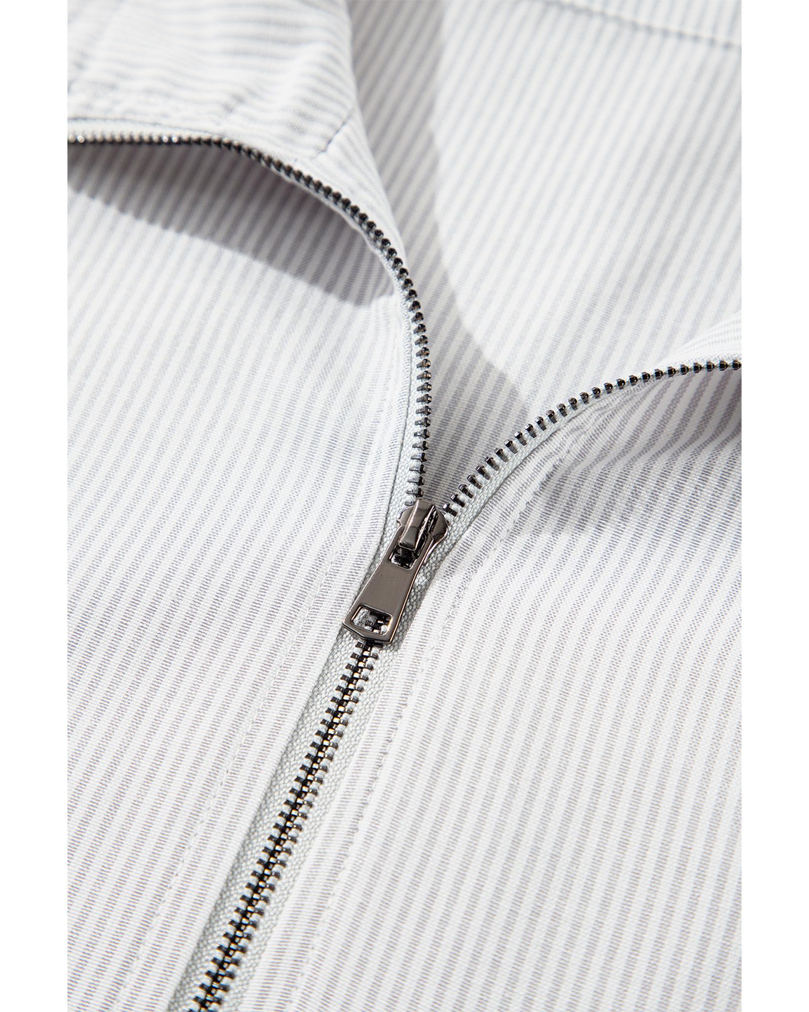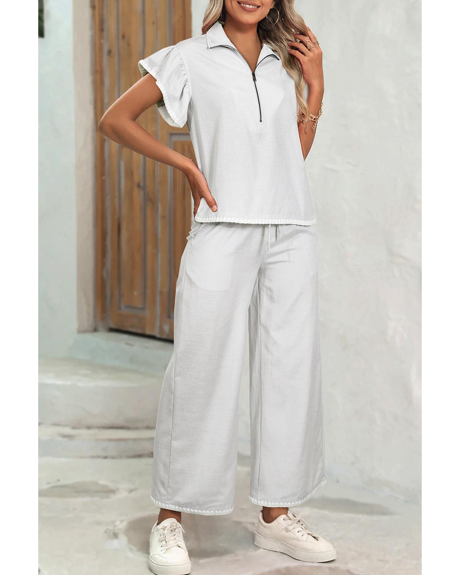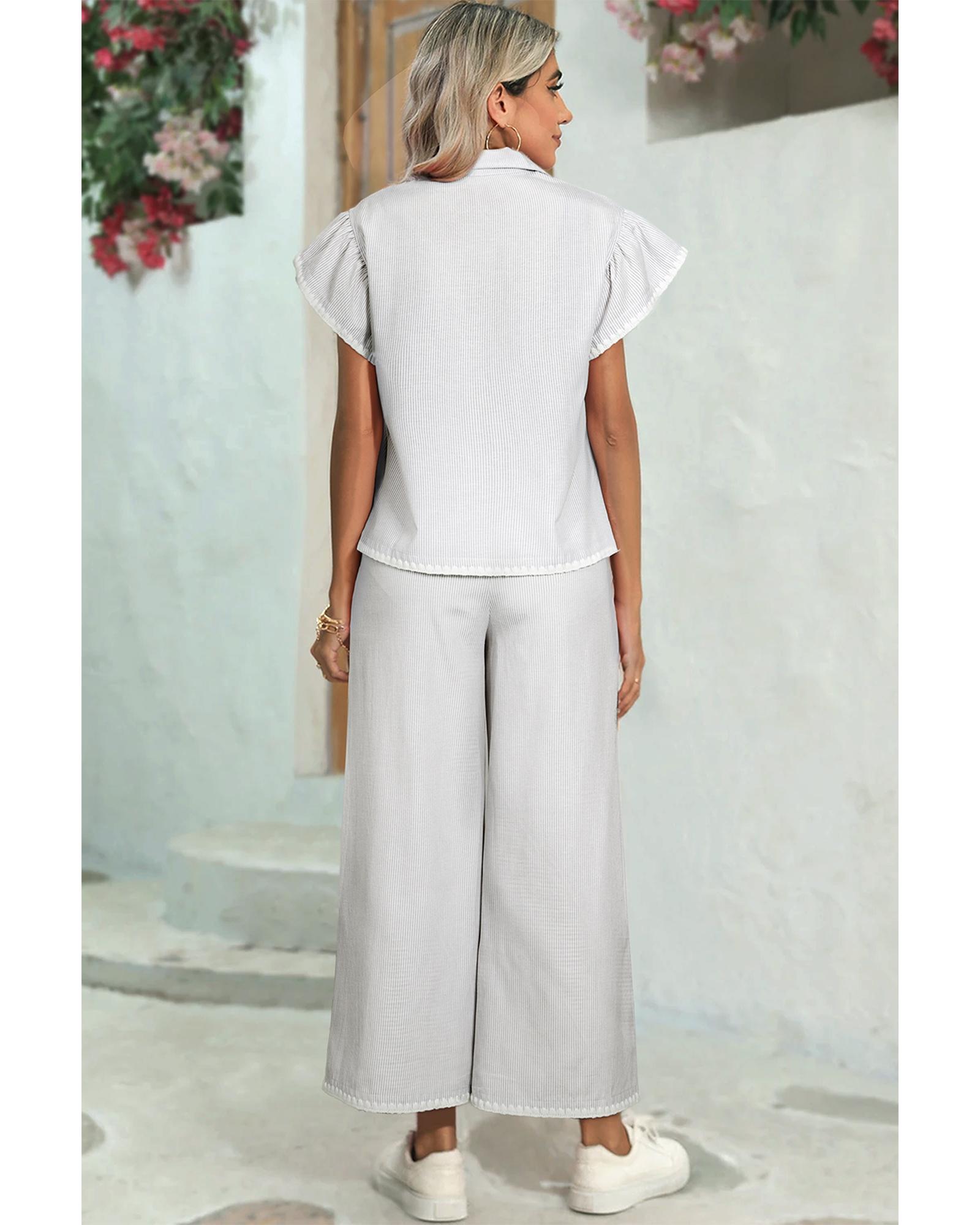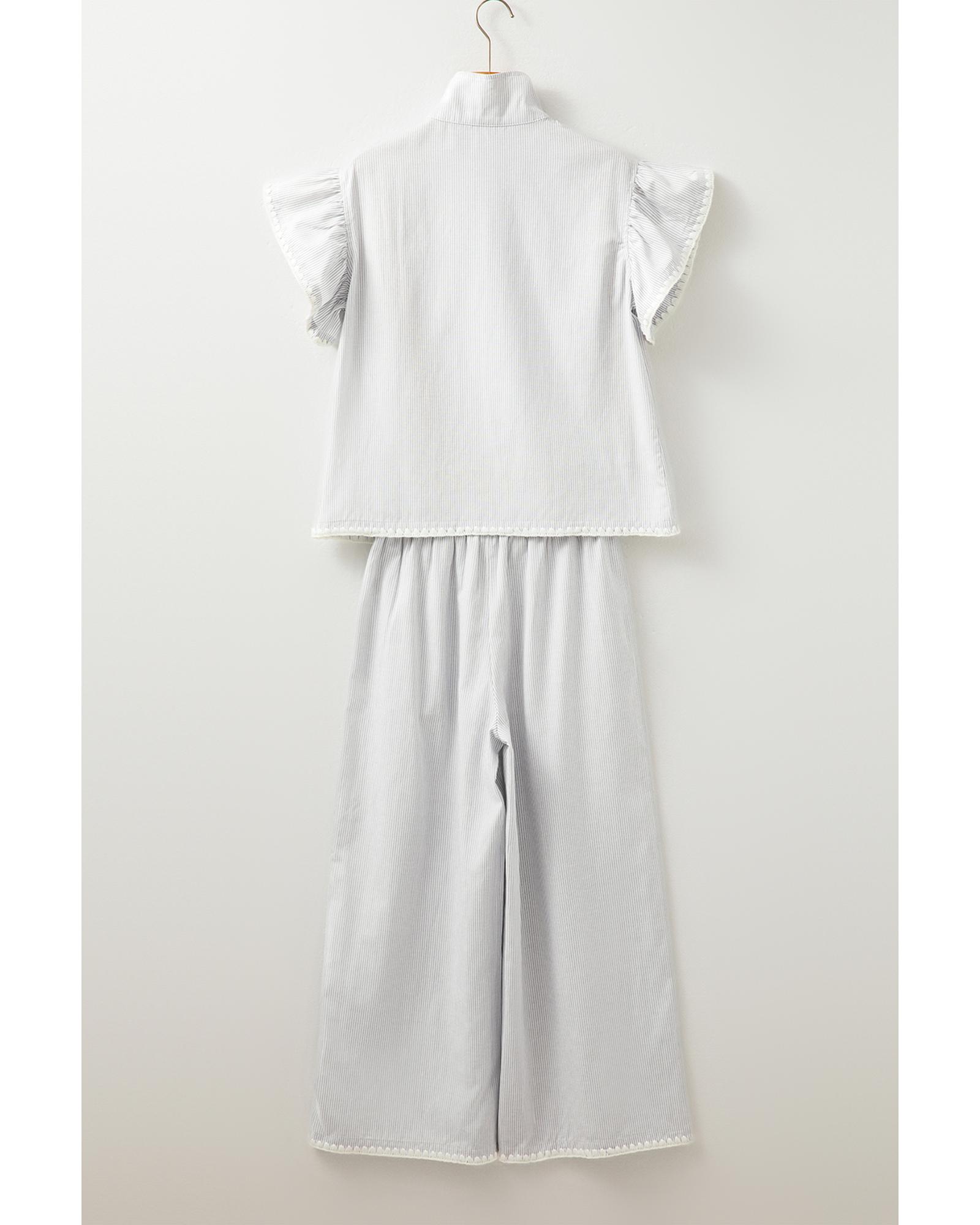 Gray Stripe Zipped up Collar Ruffled Sleeve Tee and Wide Leg Pants 2pcs Outfit – M