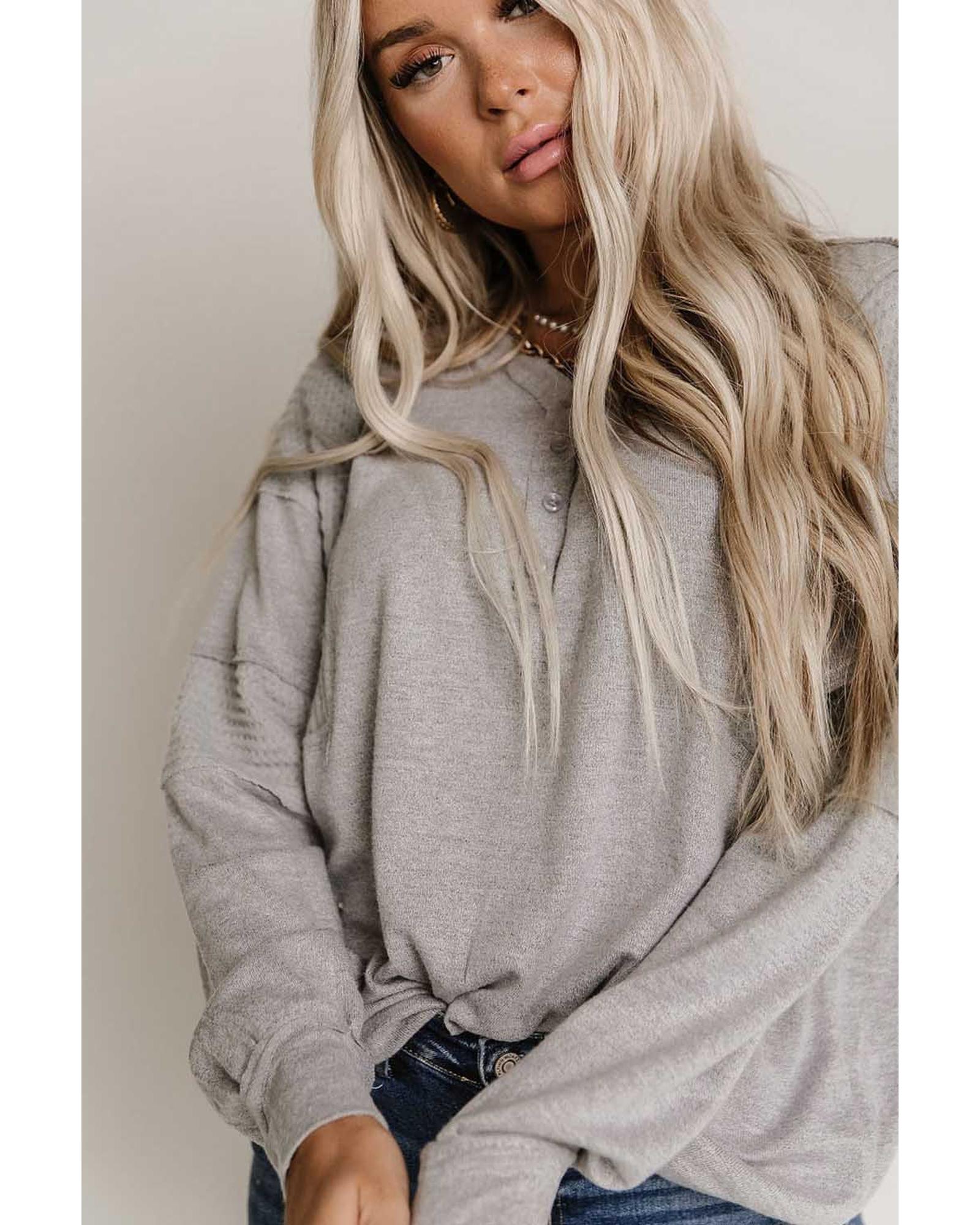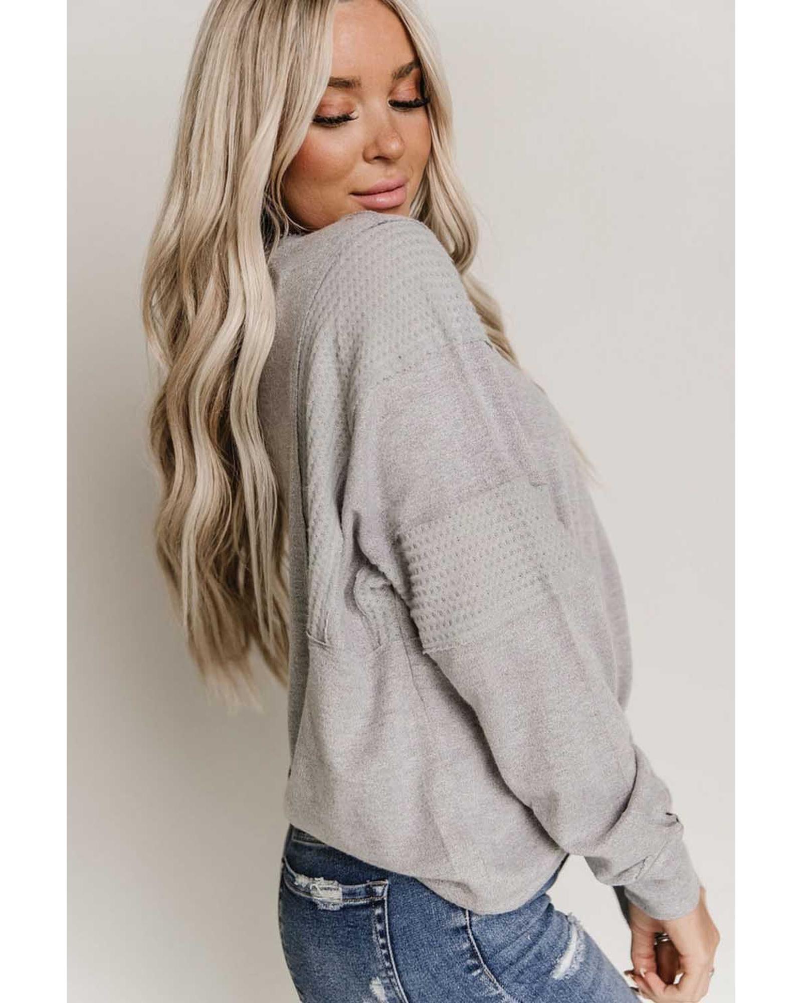 Gray Waffle Patchwork Dolman Sleeve Henley Top – L