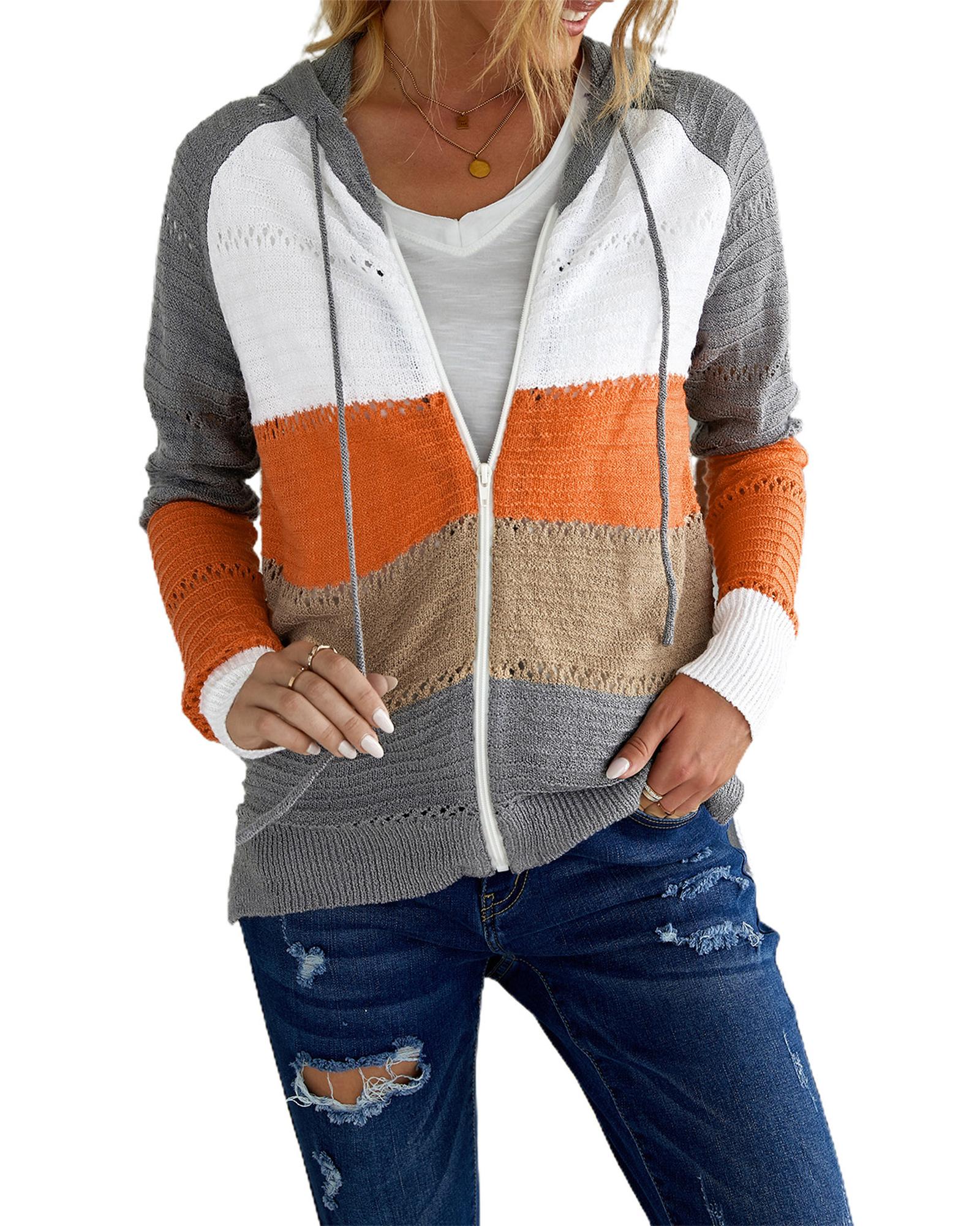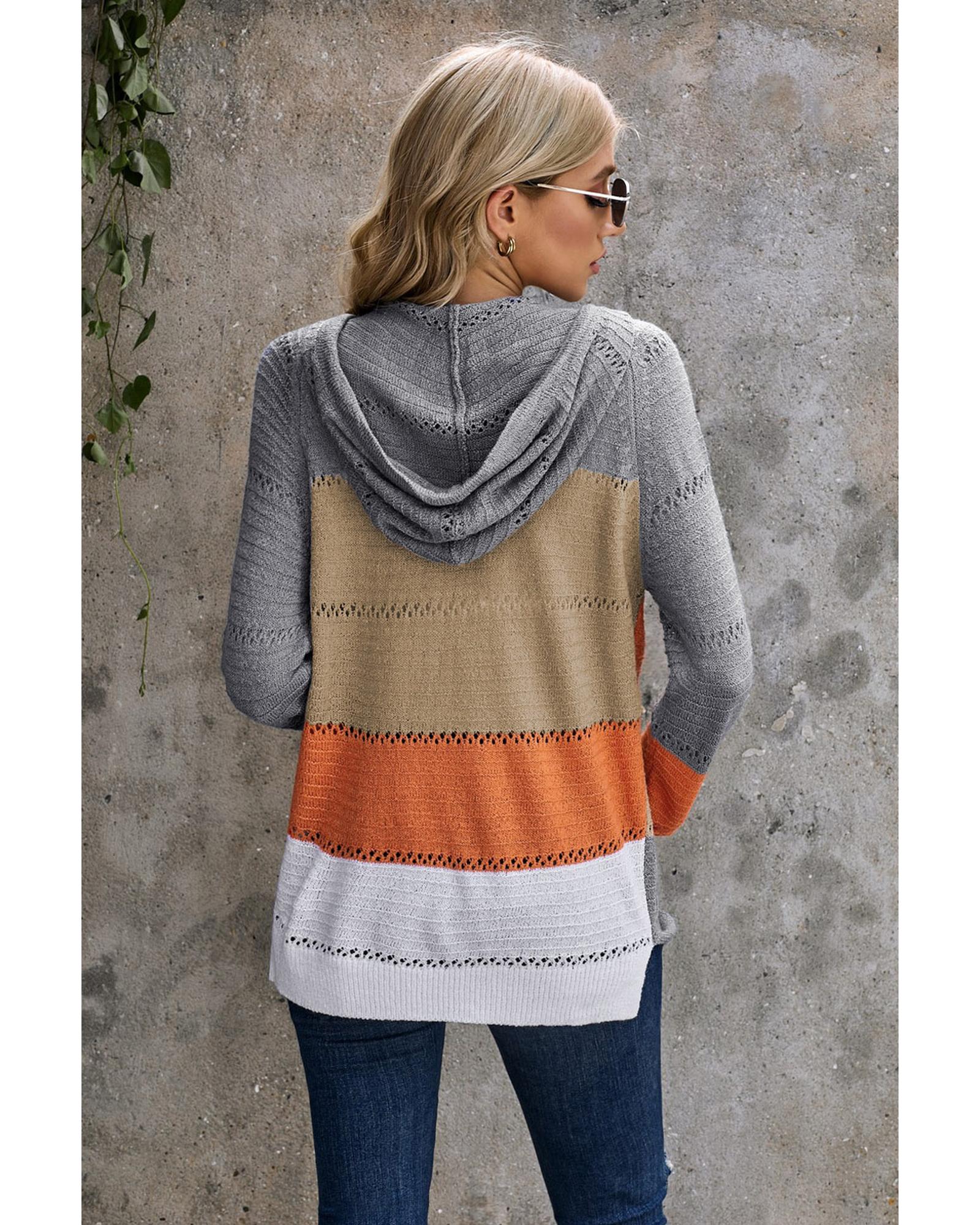 Gray Zipped Front Colorblock Hollow-out Knit Hoodie – L