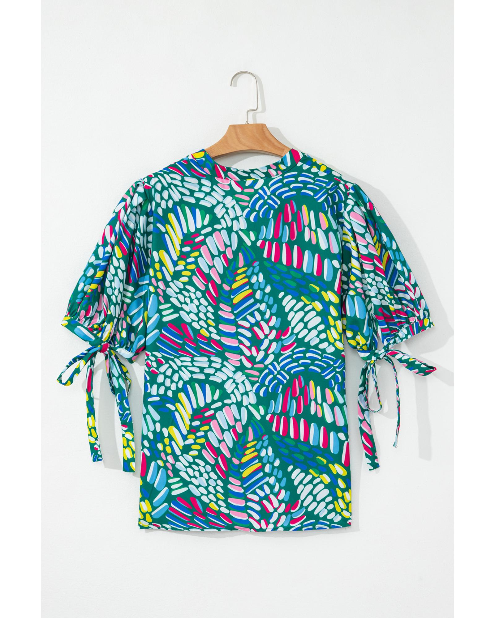 Green Abstract Print Knotted Short Sleeve Plus Size Blouse – 1X