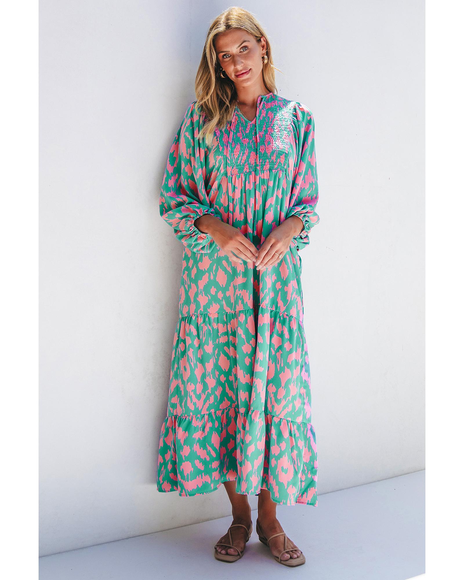 Green Abstract Print Puff Sleeve Tied Notched Neck Long Dress – M