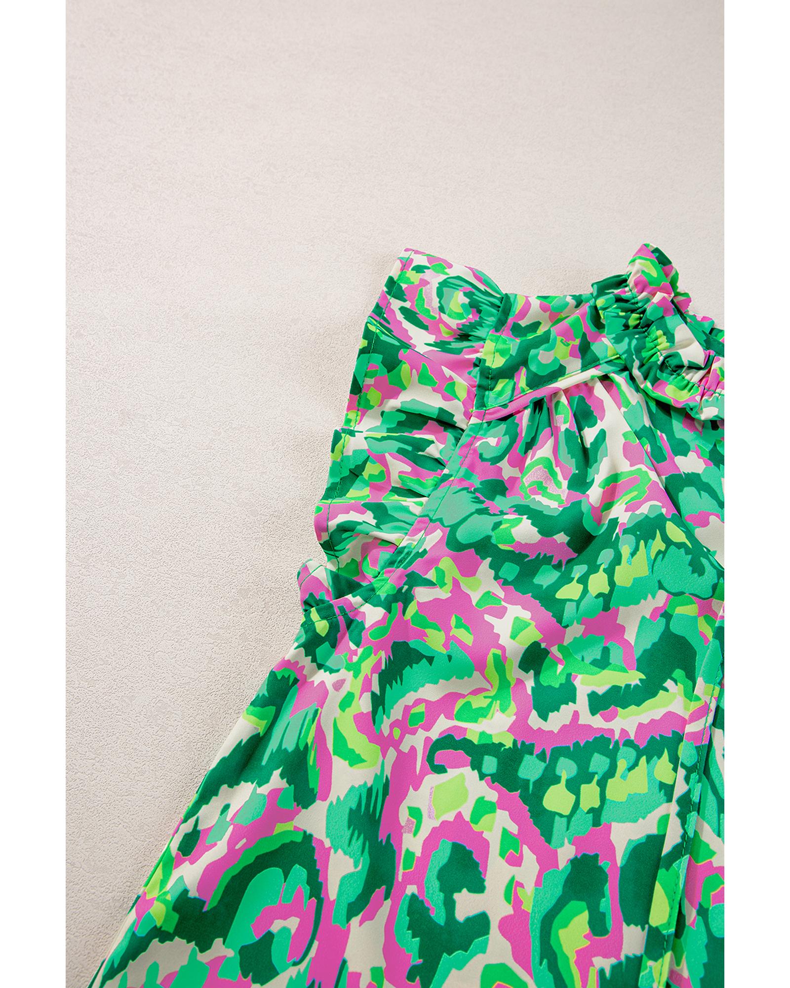 Green Abstract Print Ruffled Trim Tied Split Neck Tank Top – M