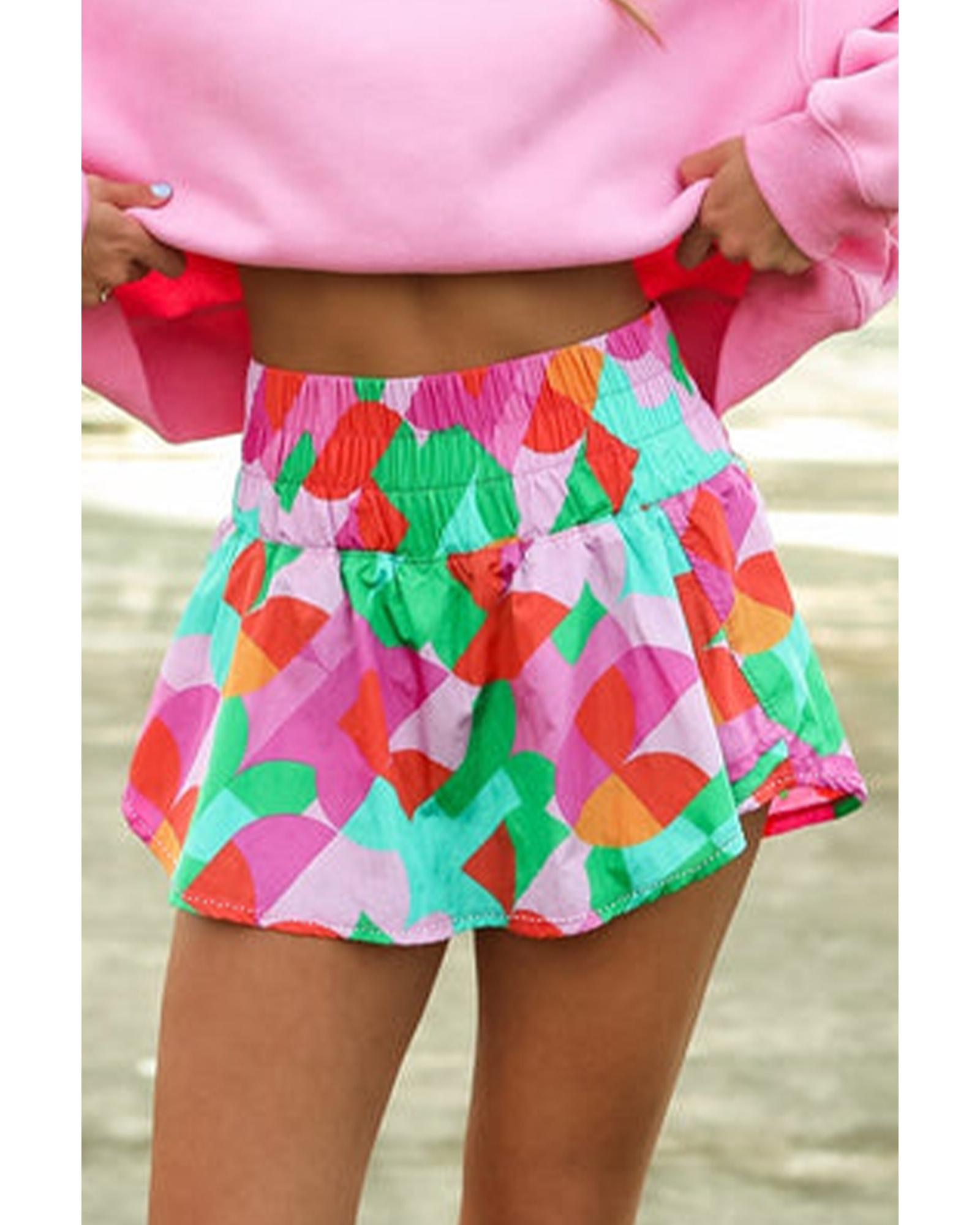 Green Abstract Print Smock Waist Casual Shorts – L