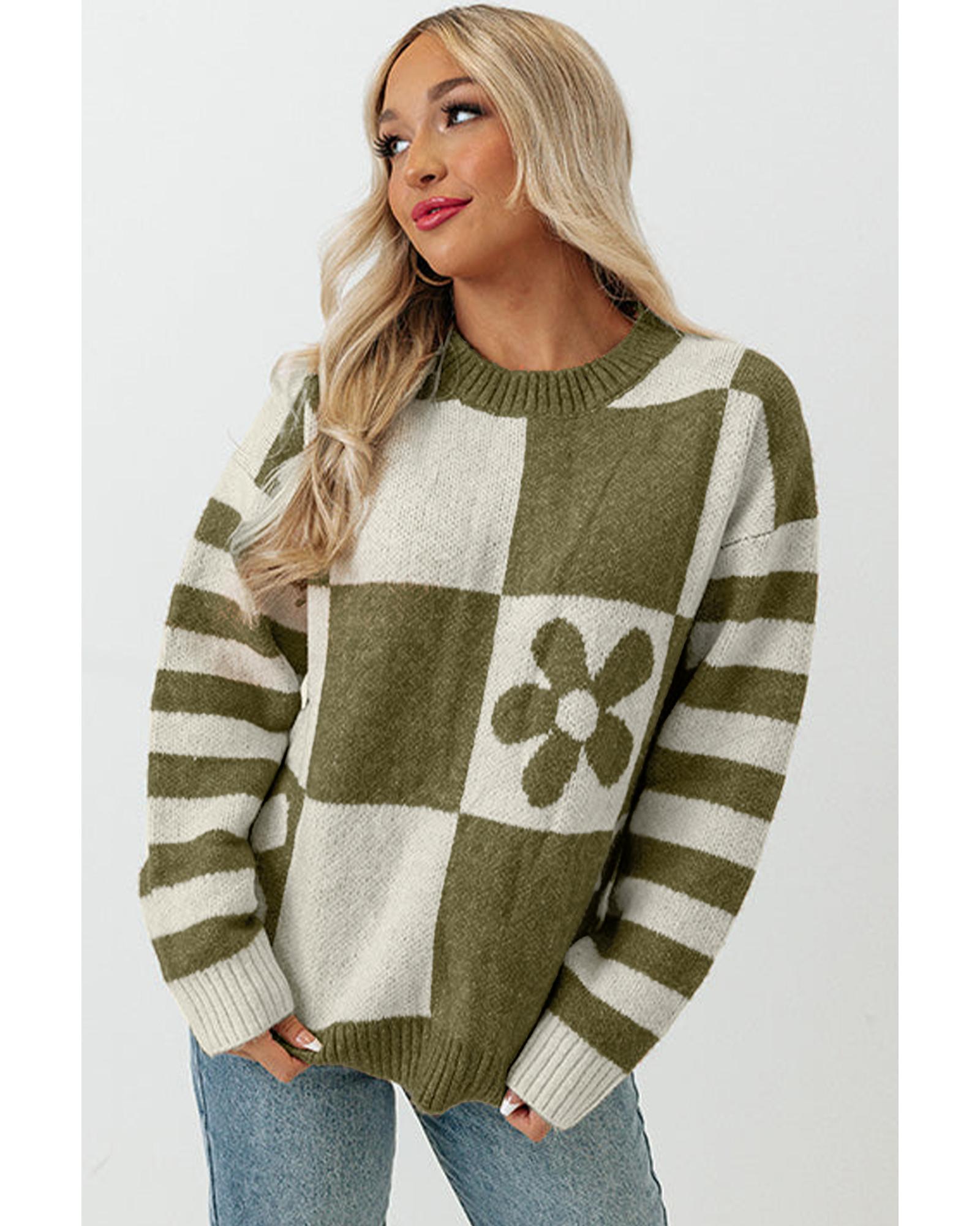 - Trendy and warm Green Checkered Floral Print Striped Sleeve Sweater