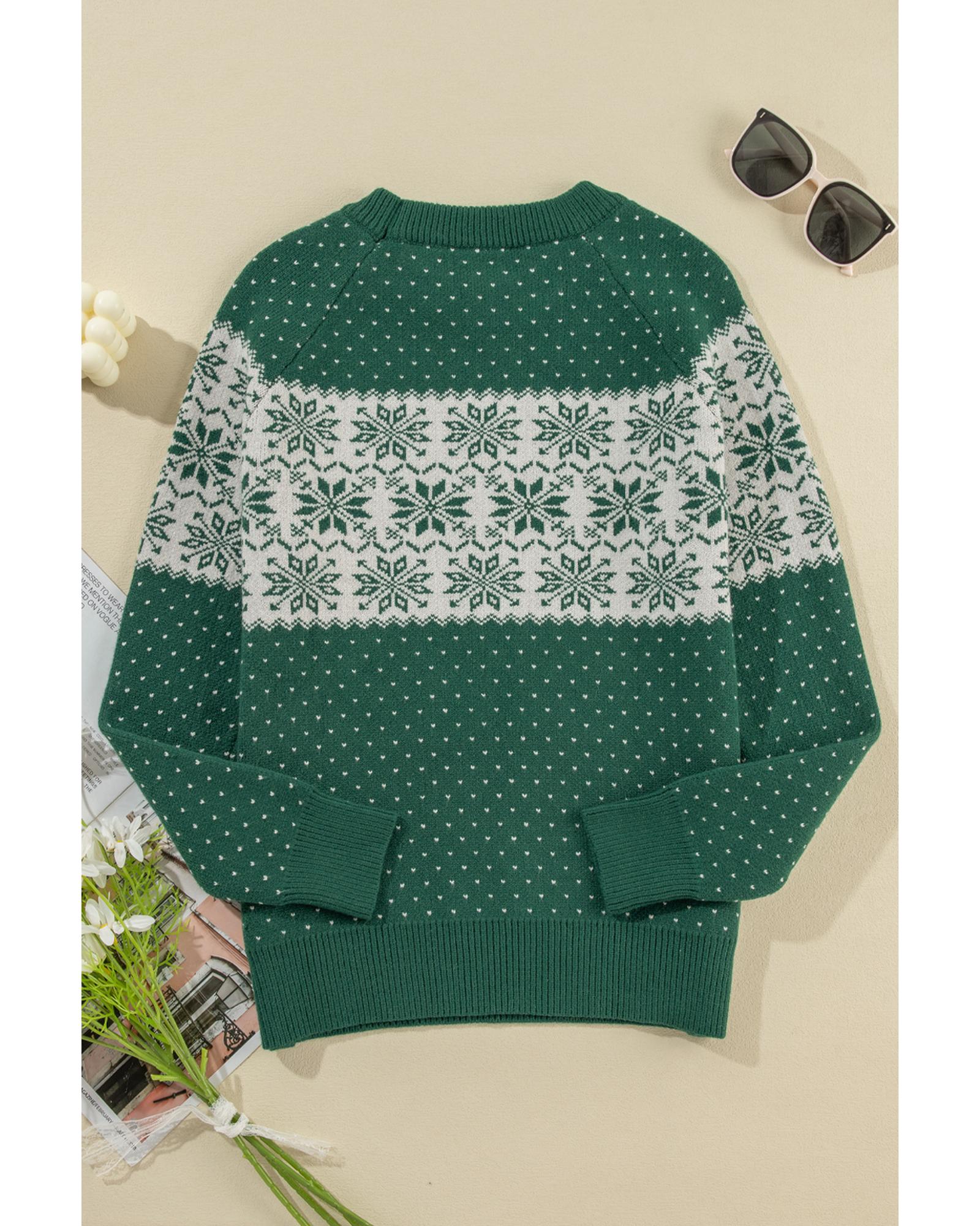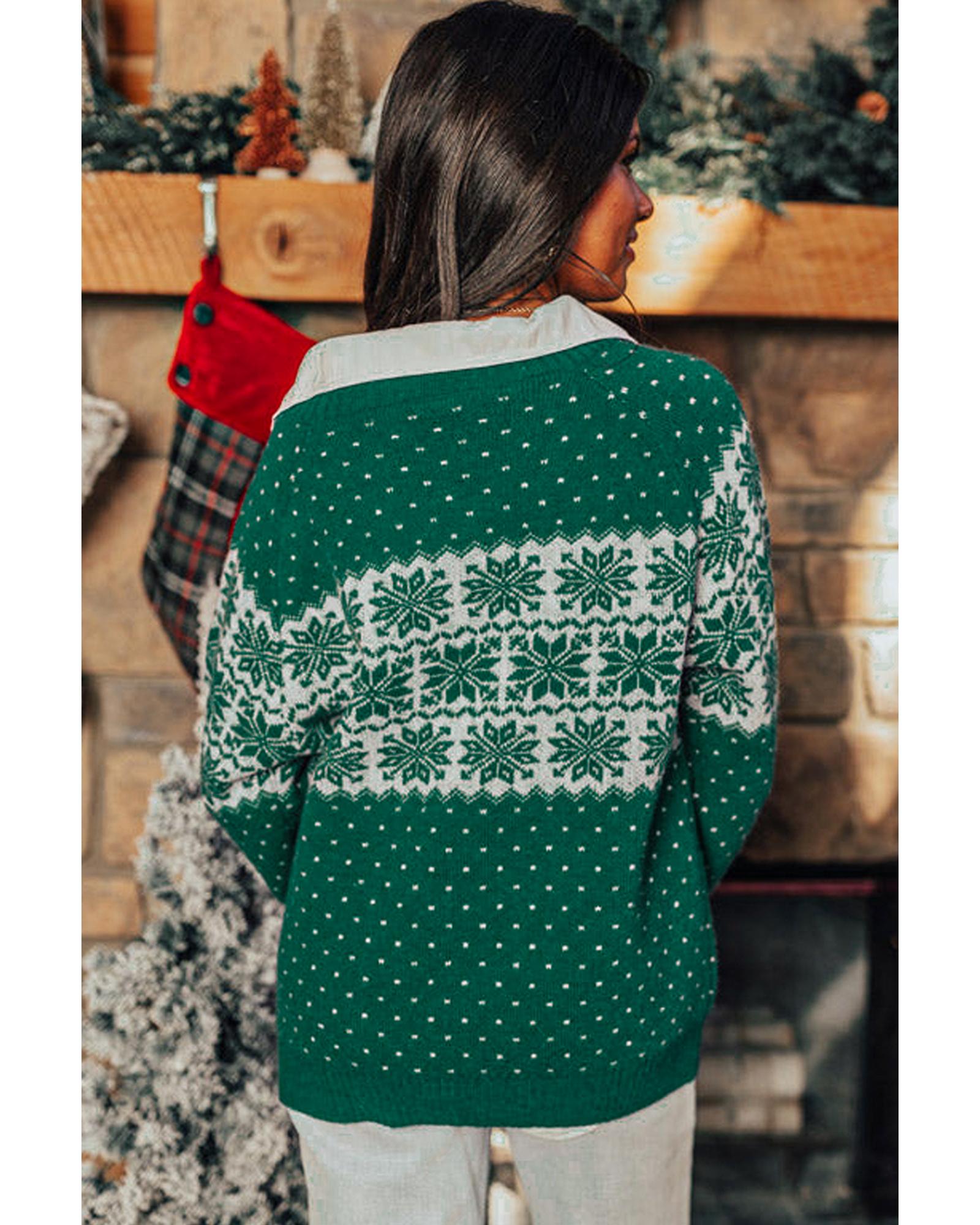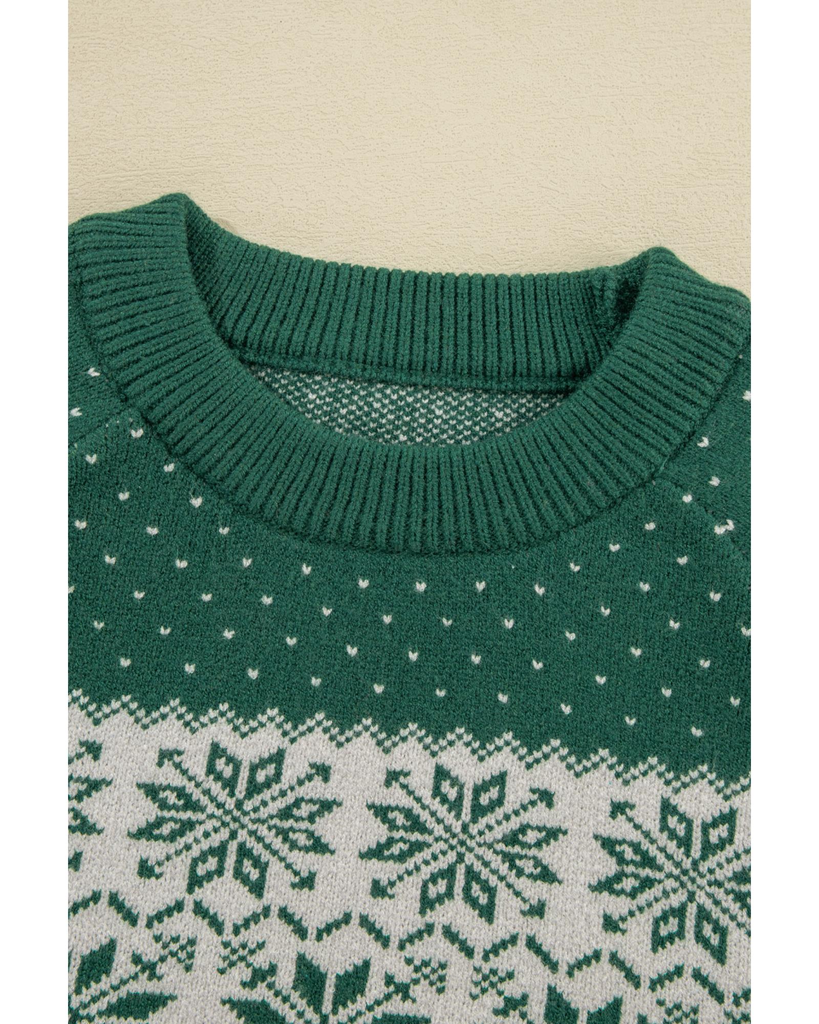 • Green Christmas Snowflake Dotted Print Round Neck Sweater