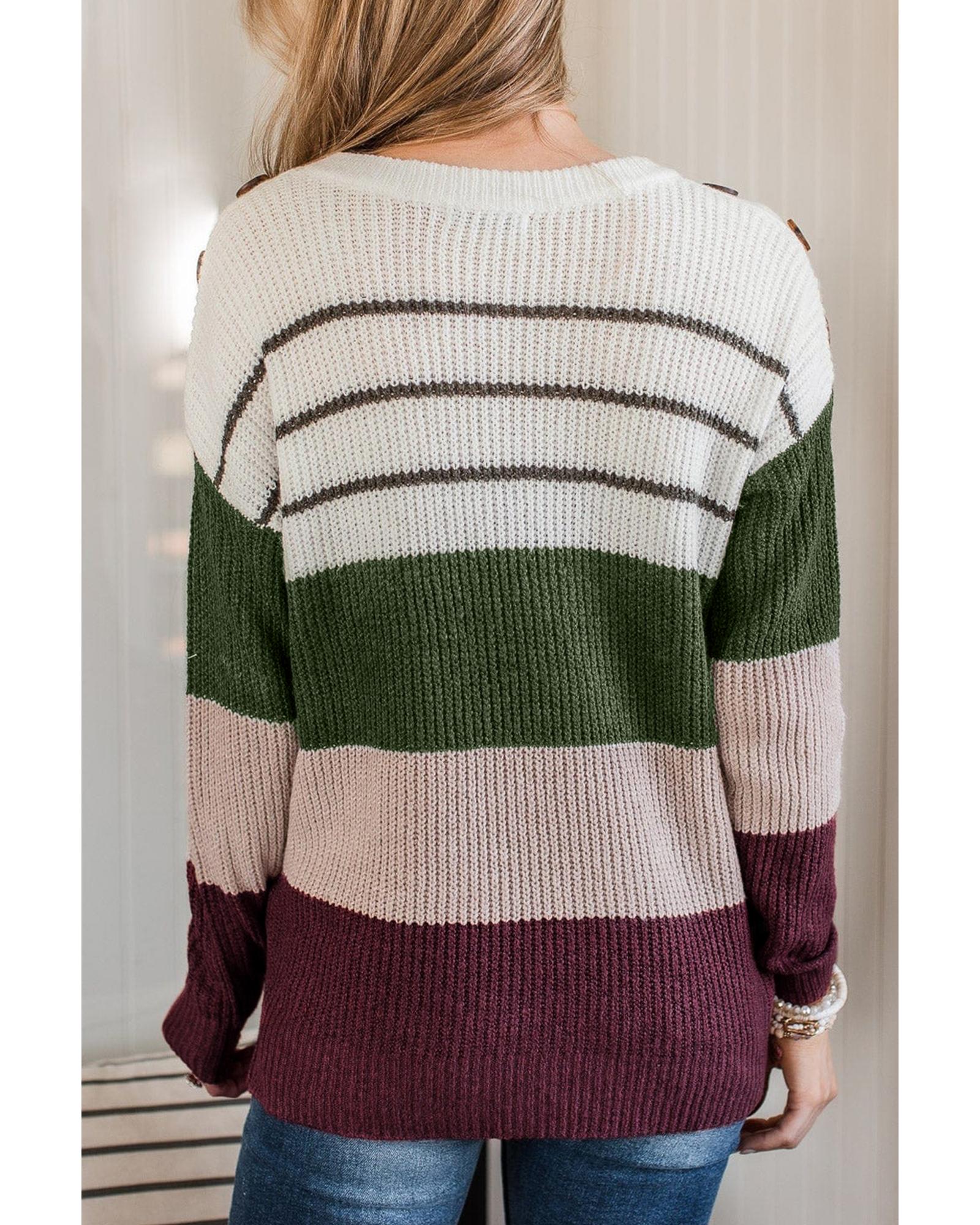 Green Color Block Striped Buttoned Shoulder Split Sweater – XL