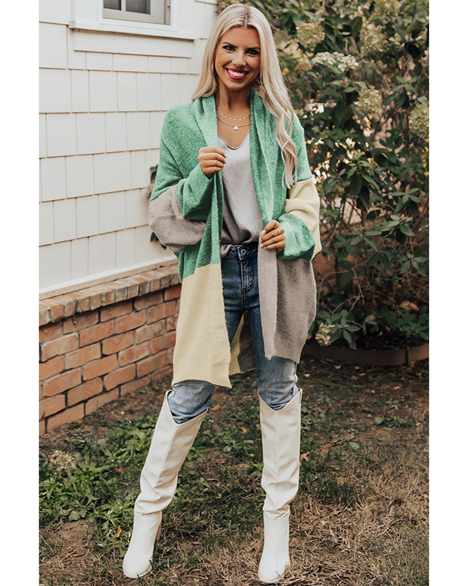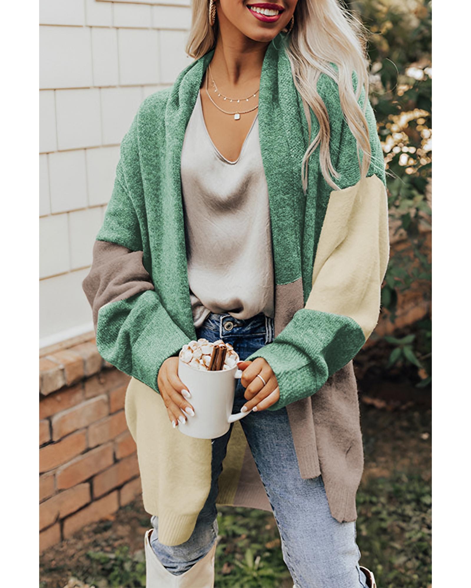 Green Colorblock Draped Open Front Chunky Cardigan – S