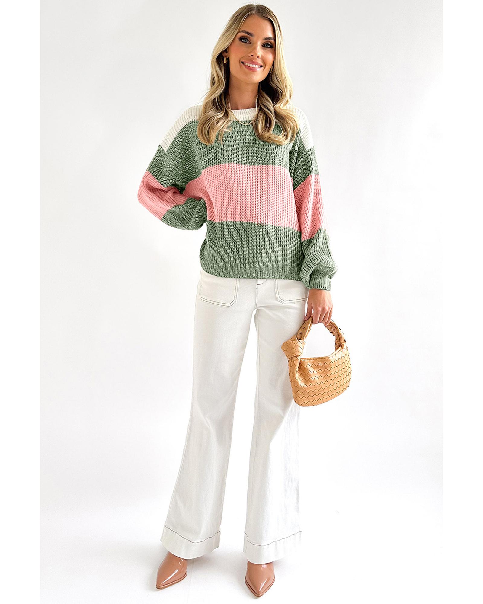 Green Colorblock Drop Shoulder Pullover Loose Sweater – M