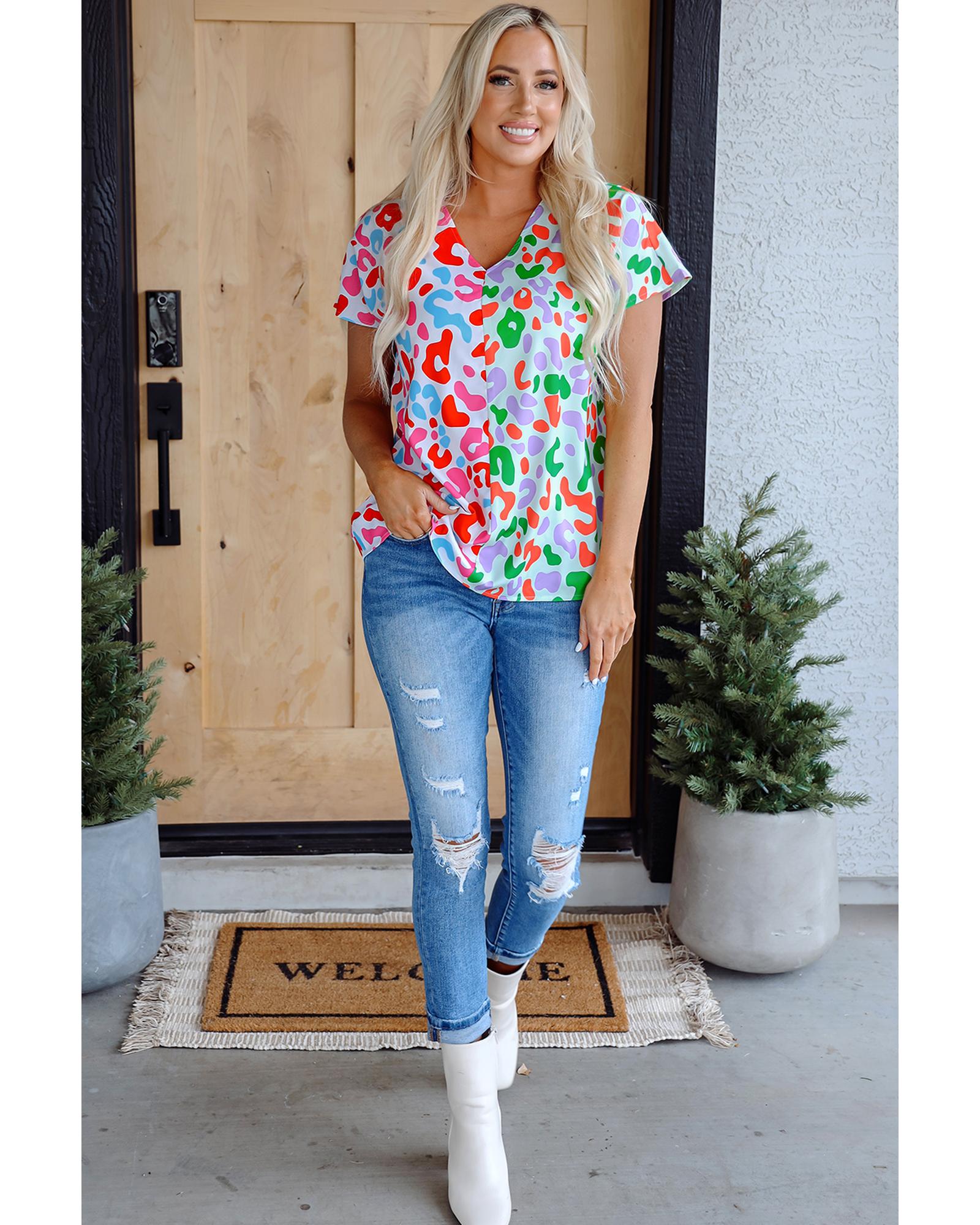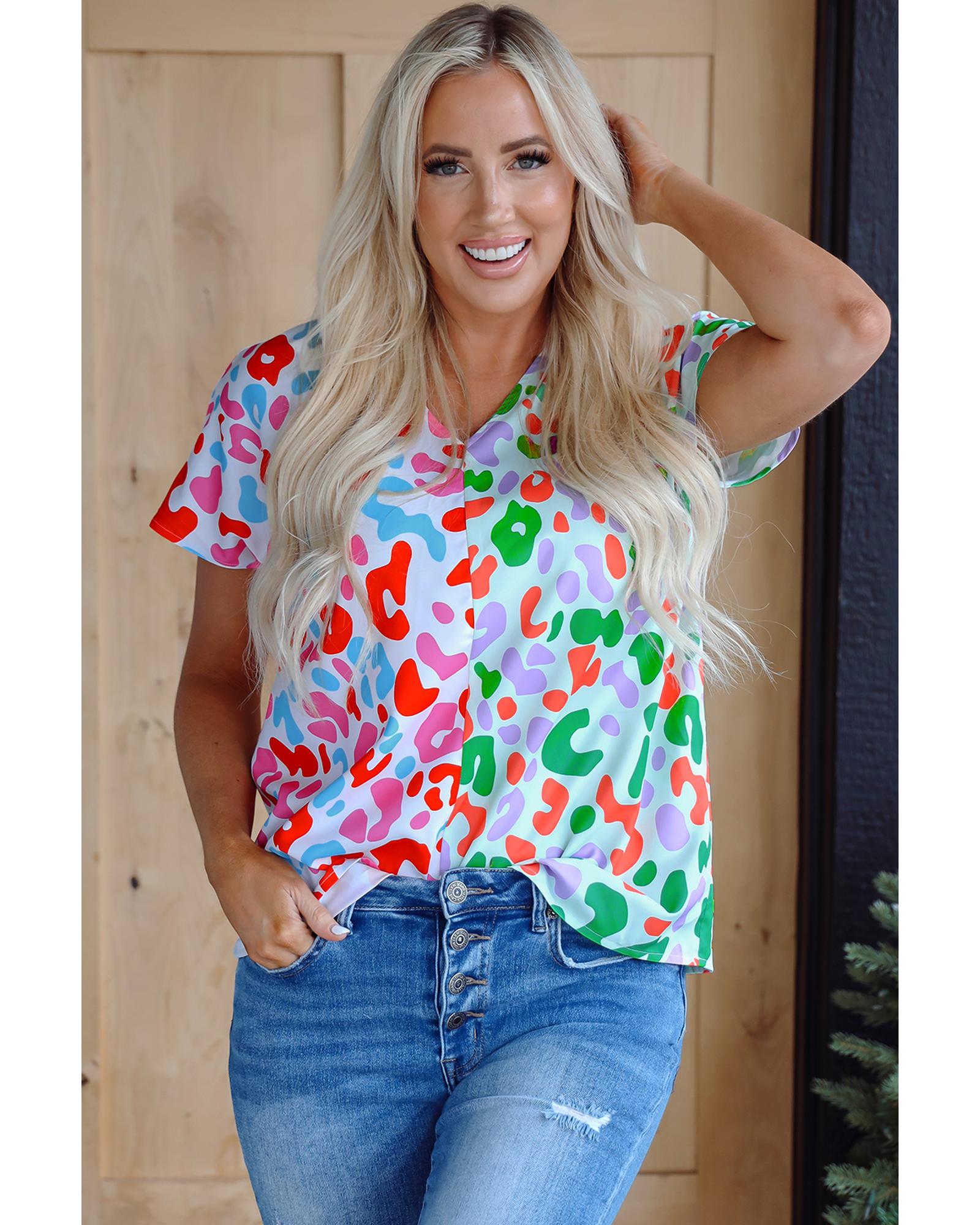 Green Contrast Leopard Print V Neck Short Sleeve Blouse – M