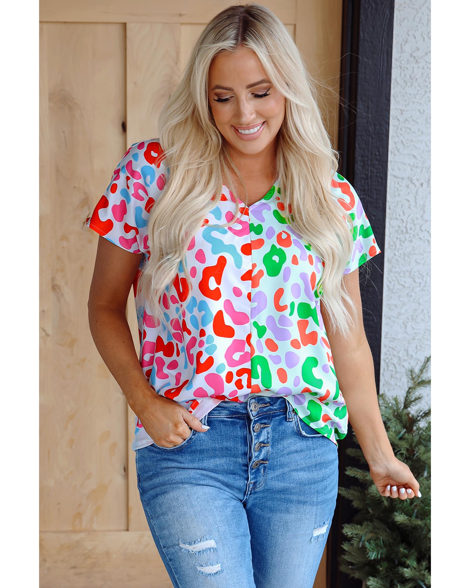 Green Contrast Leopard Print V Neck Short Sleeve Blouse – S