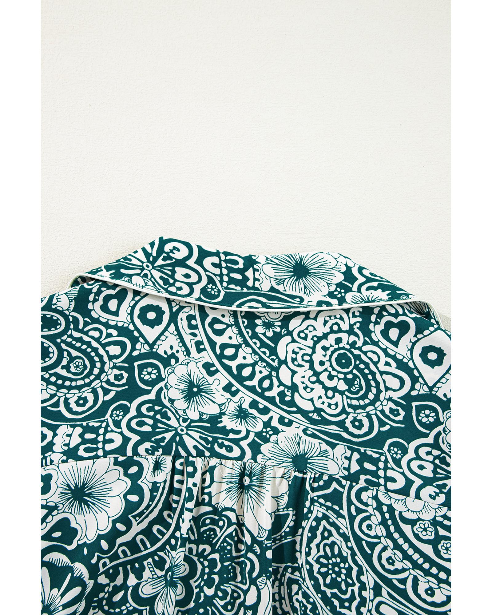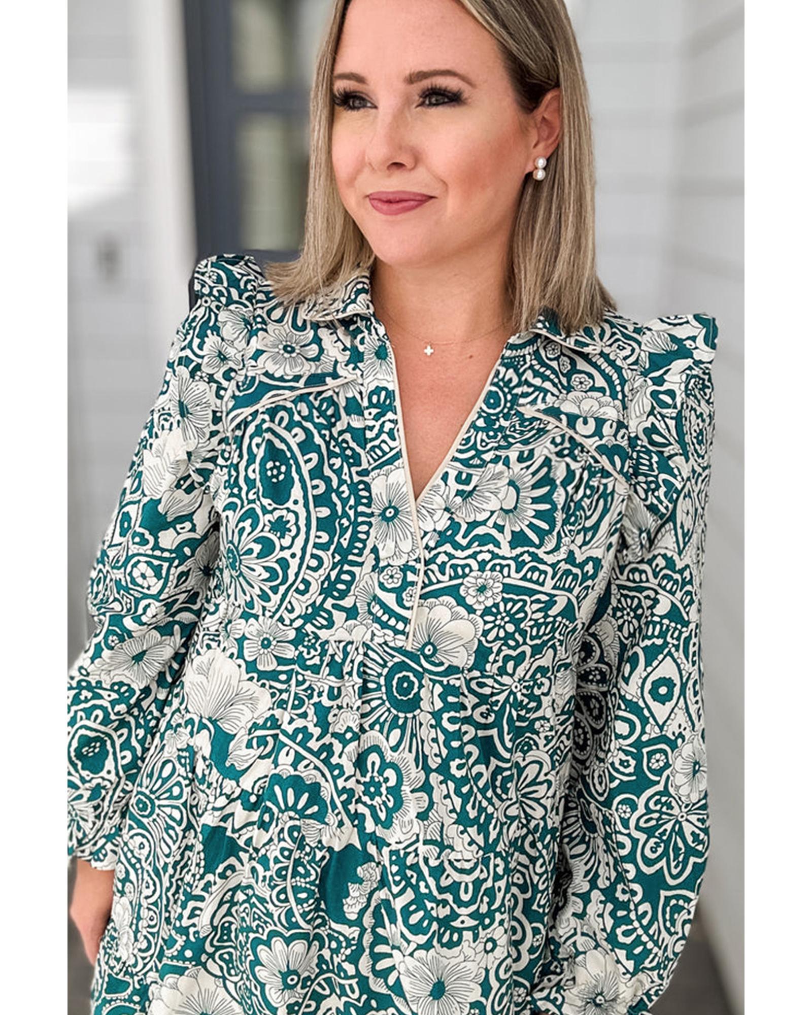 • Green Floral Flounce Sleeve Split Neck Plus Size Dress