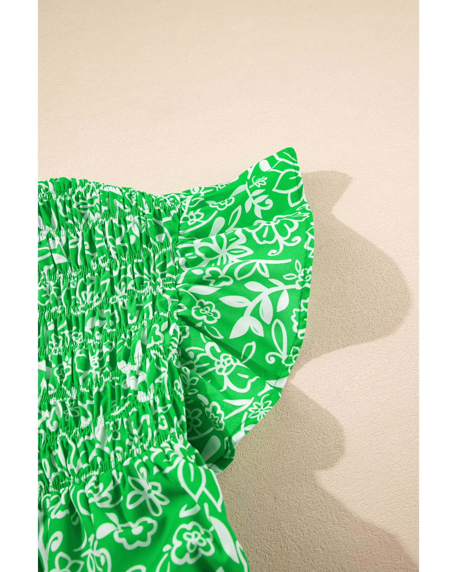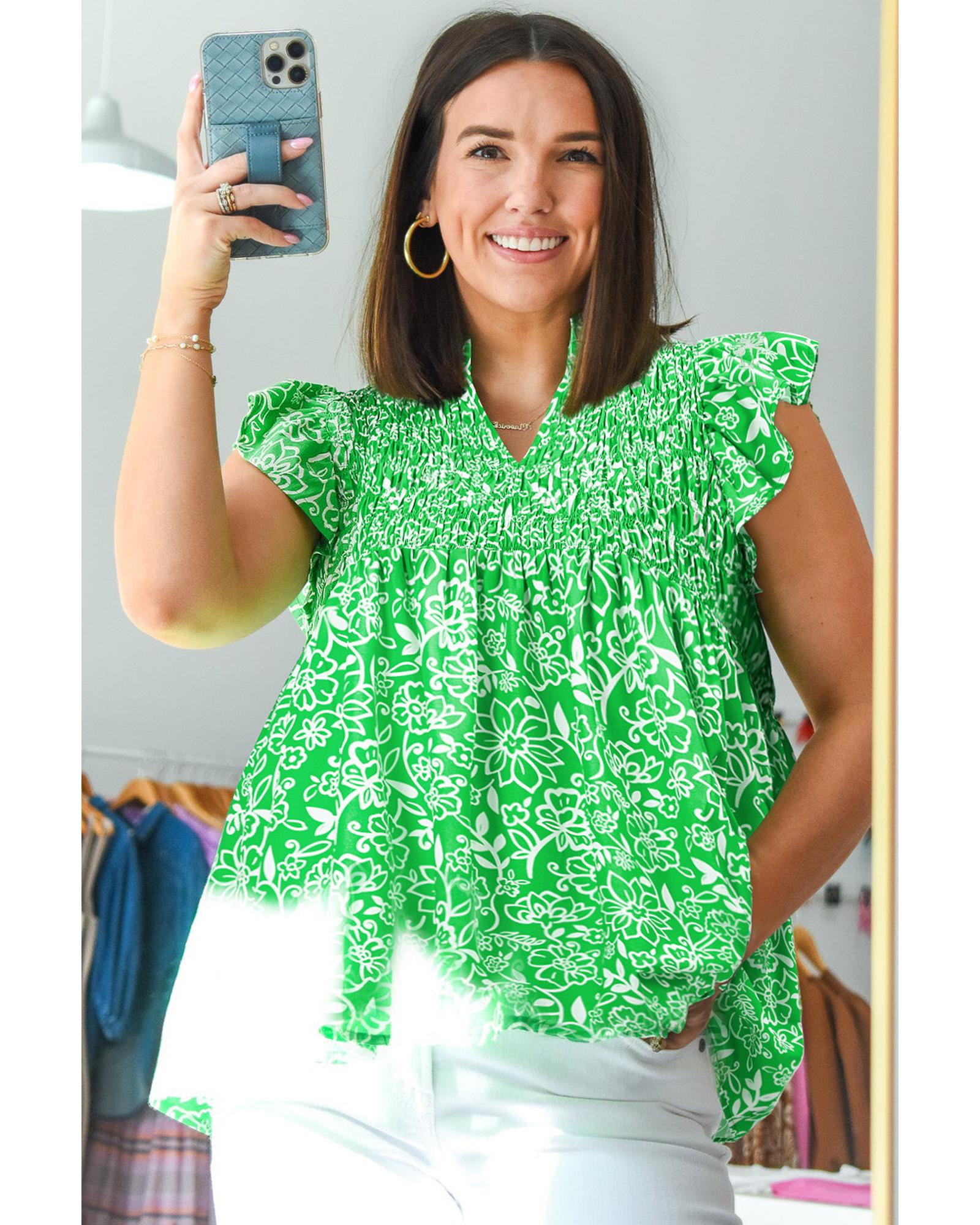 Green Floral Flutter Sleeve Shirred Notched Neck Plus Size Blouse – 1X