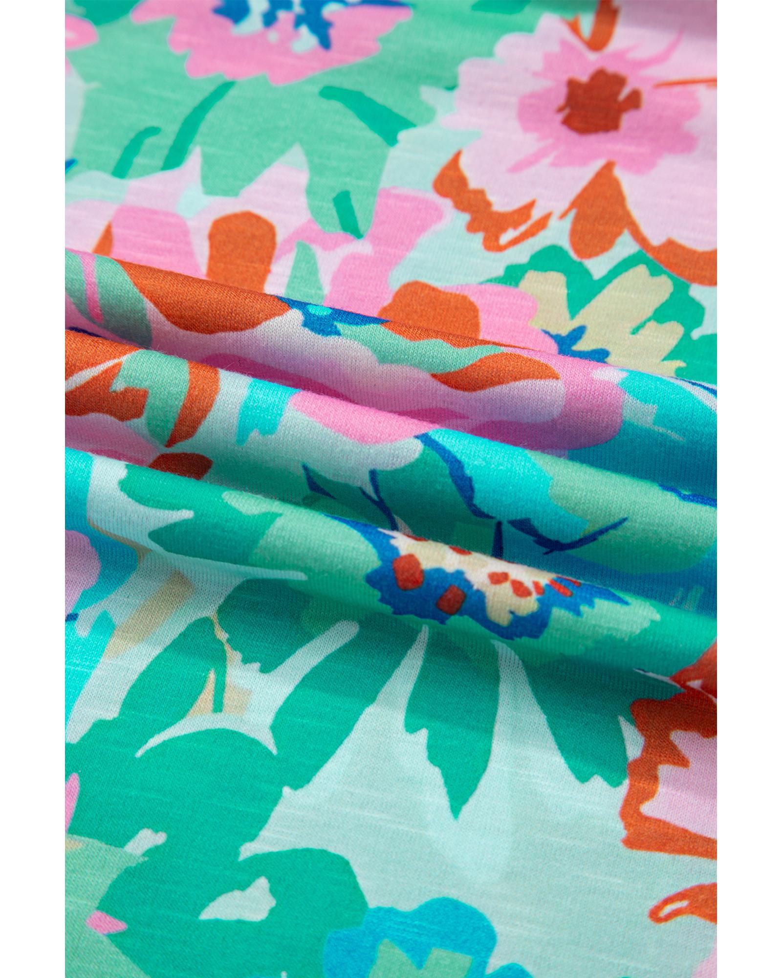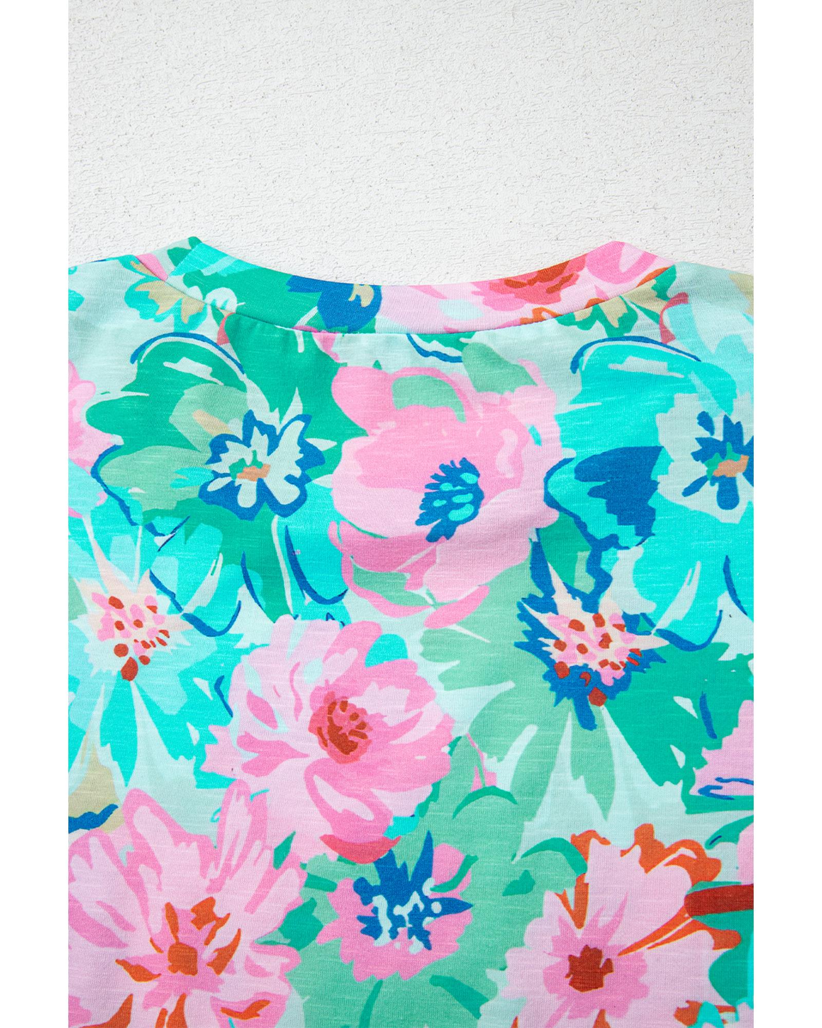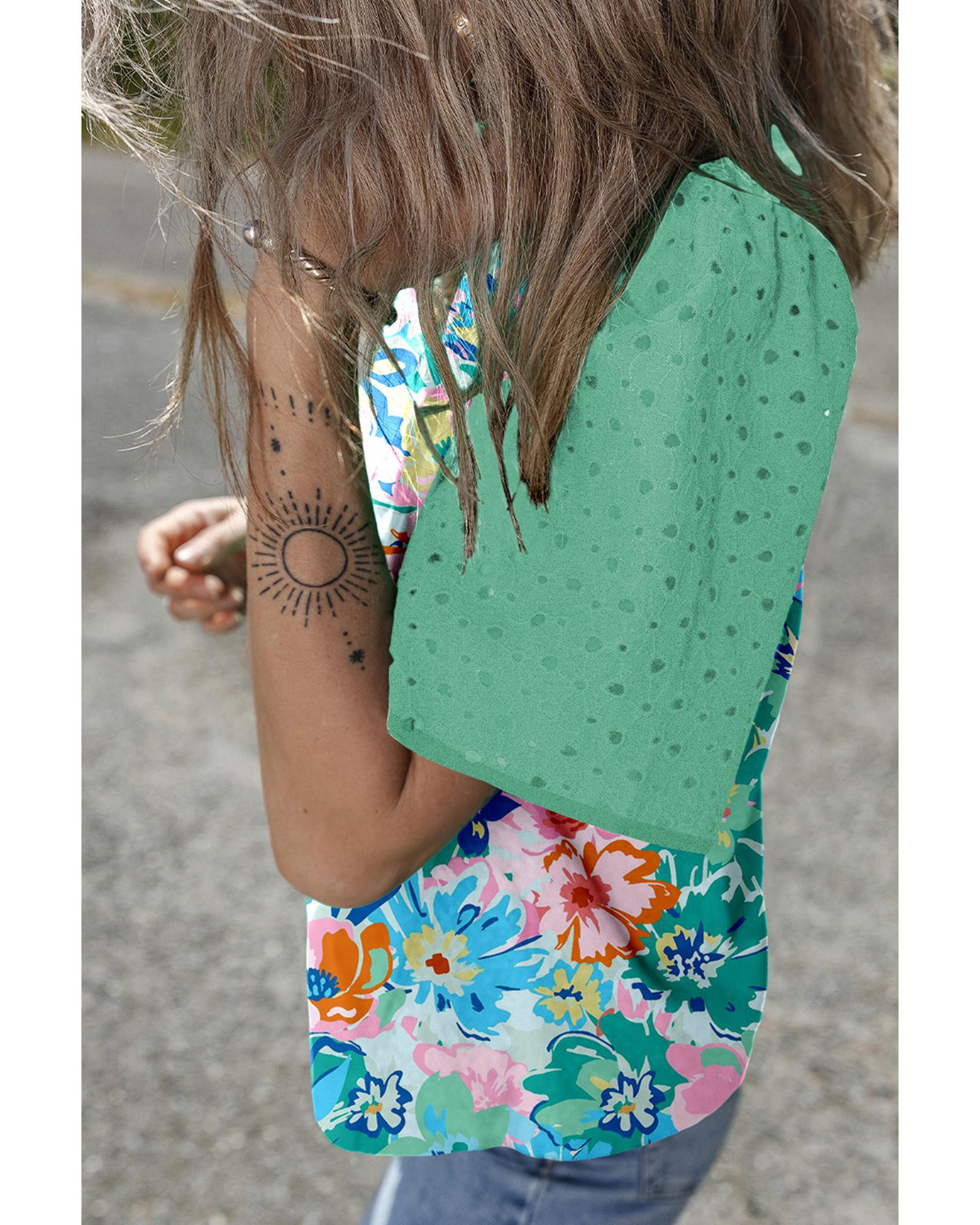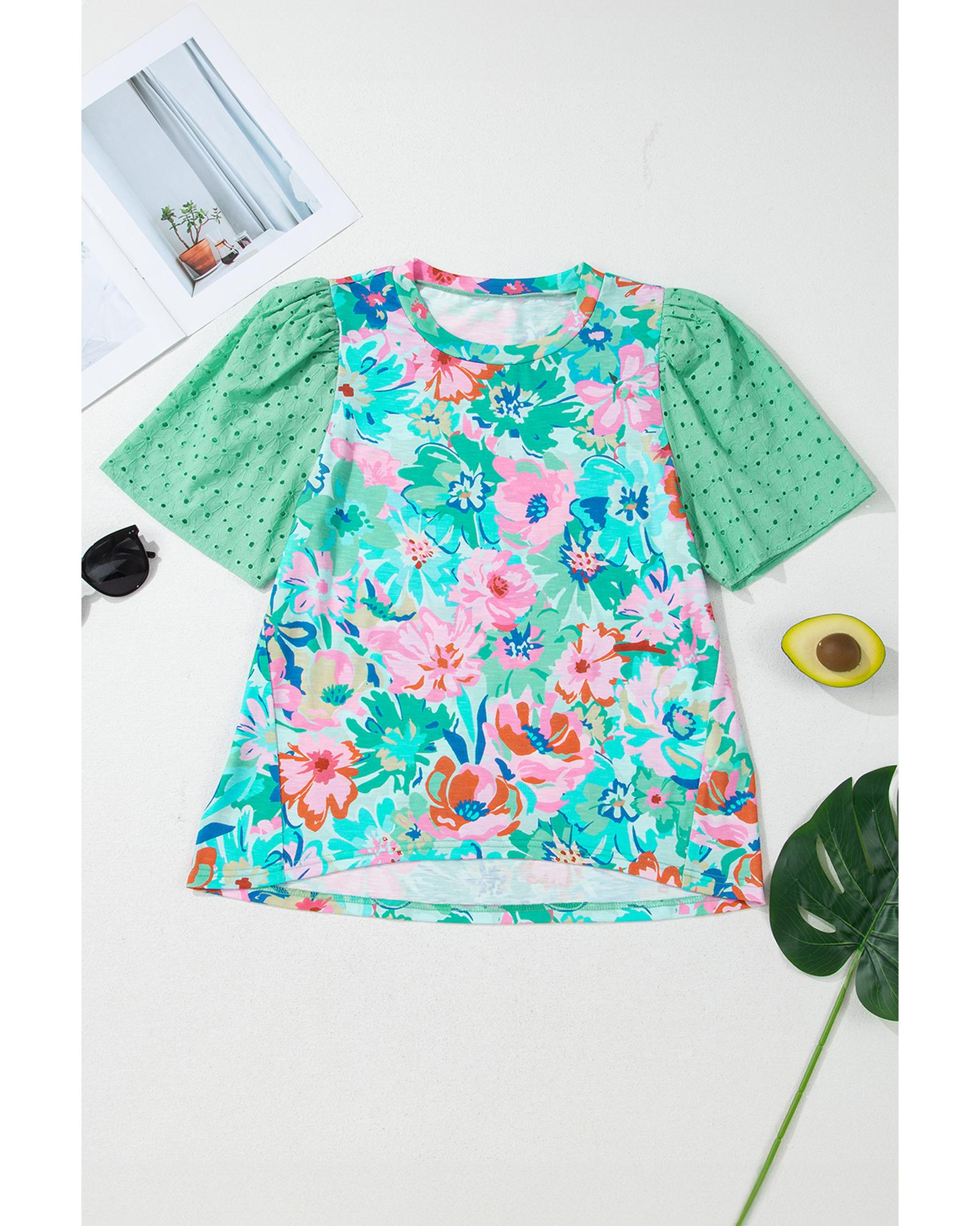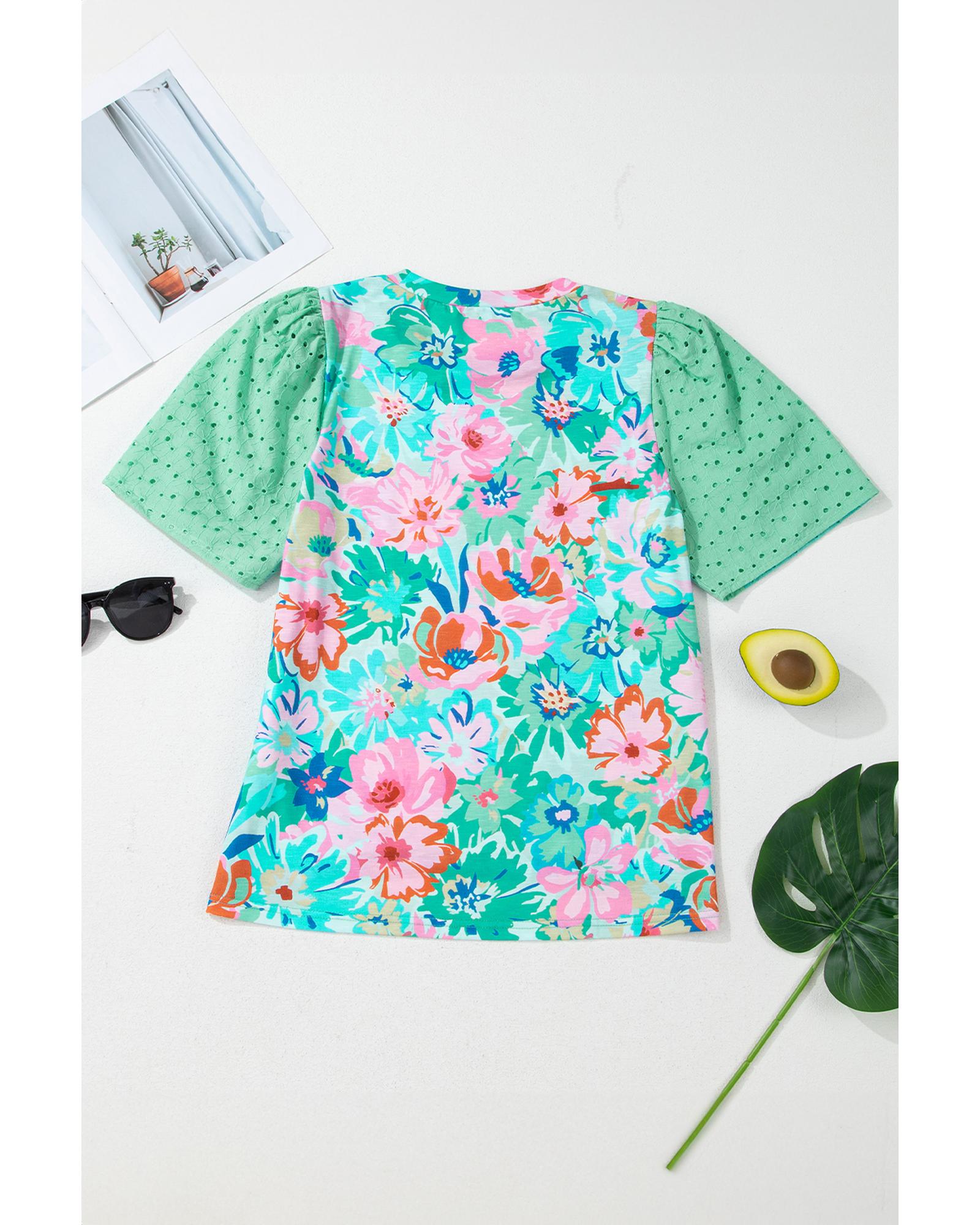 Green Floral Print Eyelet Embroidered Short Sleeve Crew Neck Top – M