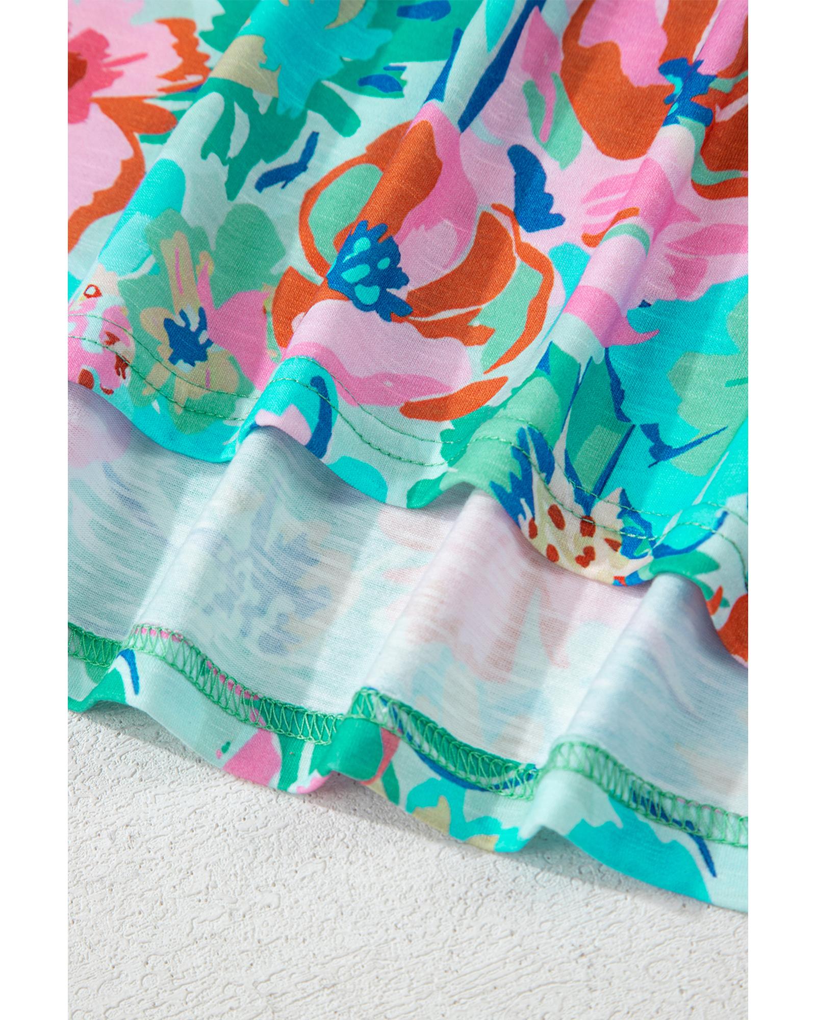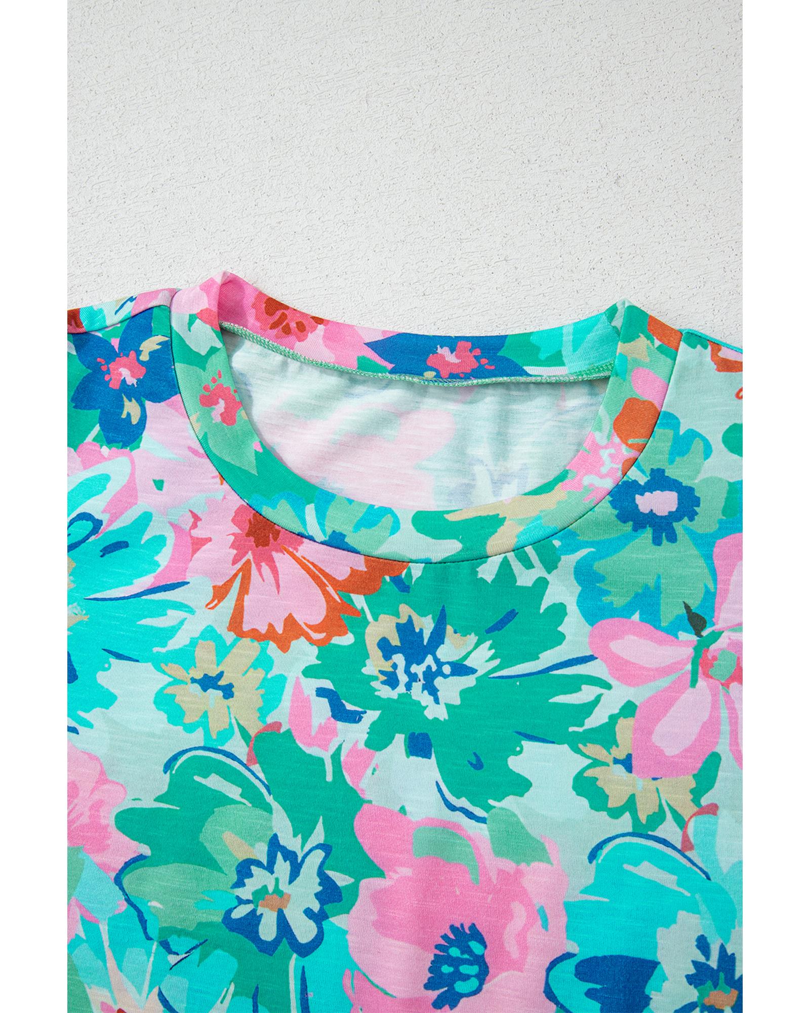 Green Floral Print Eyelet Embroidered Short Sleeve Crew Neck Top – S